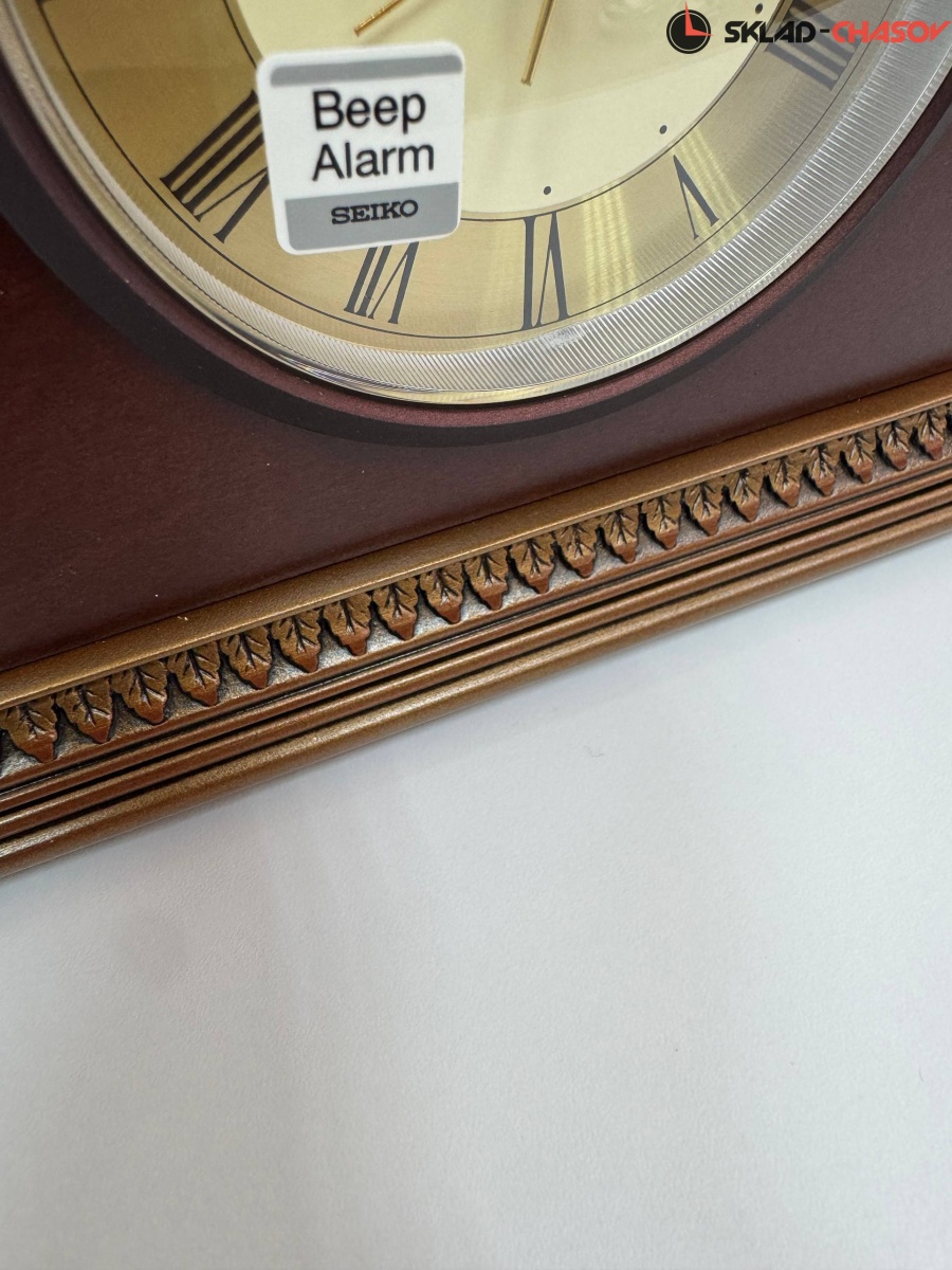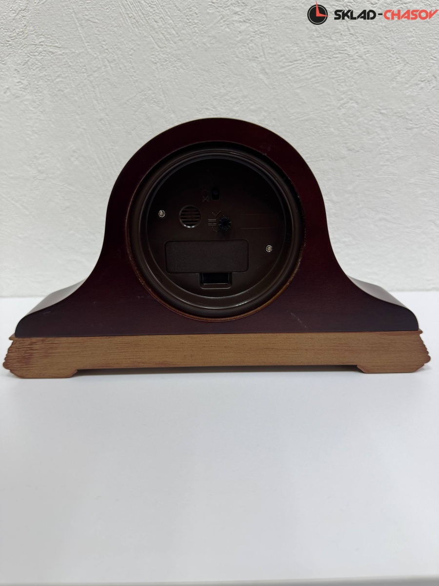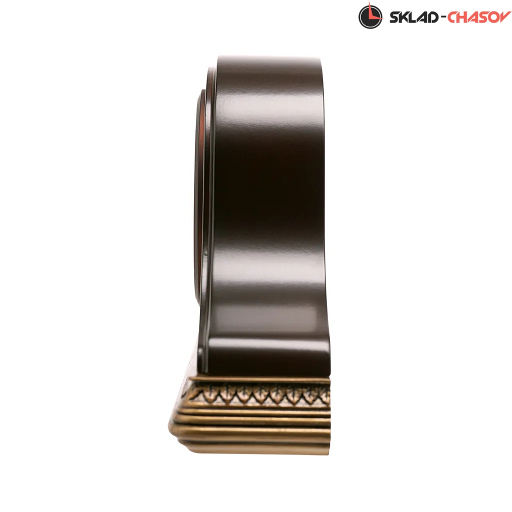 Настольные кварцевые часы-будильник с аналоговым циферблатом (стрелки). Стрелки: черная часовая, черная минутная и золотистая секундная. Белый циферблат с золотистым диском и черными римскими цифрами. Корпус выполнен из дерева.
