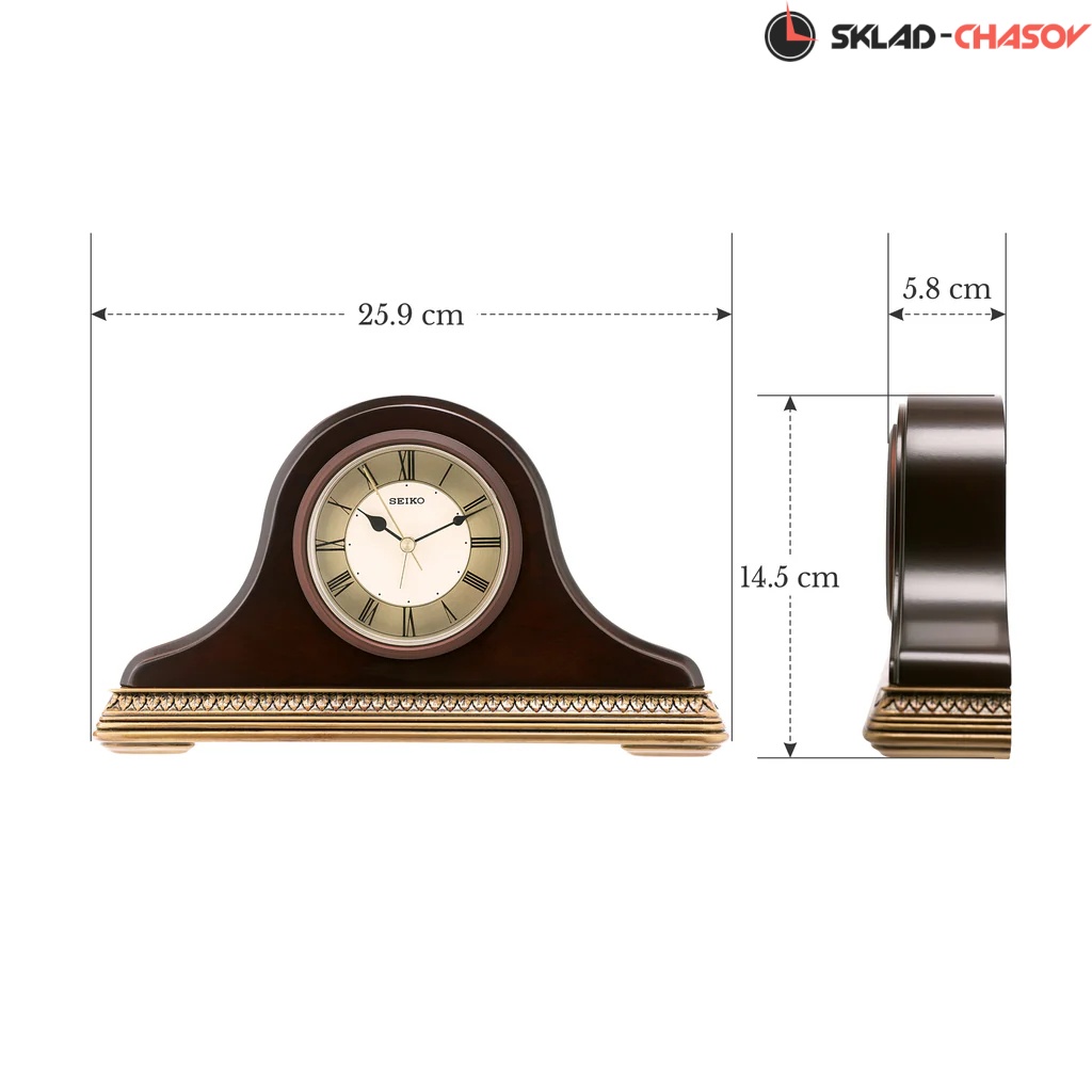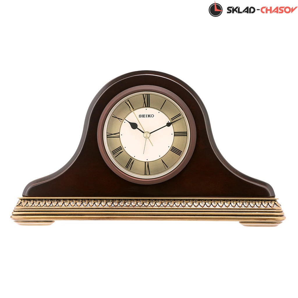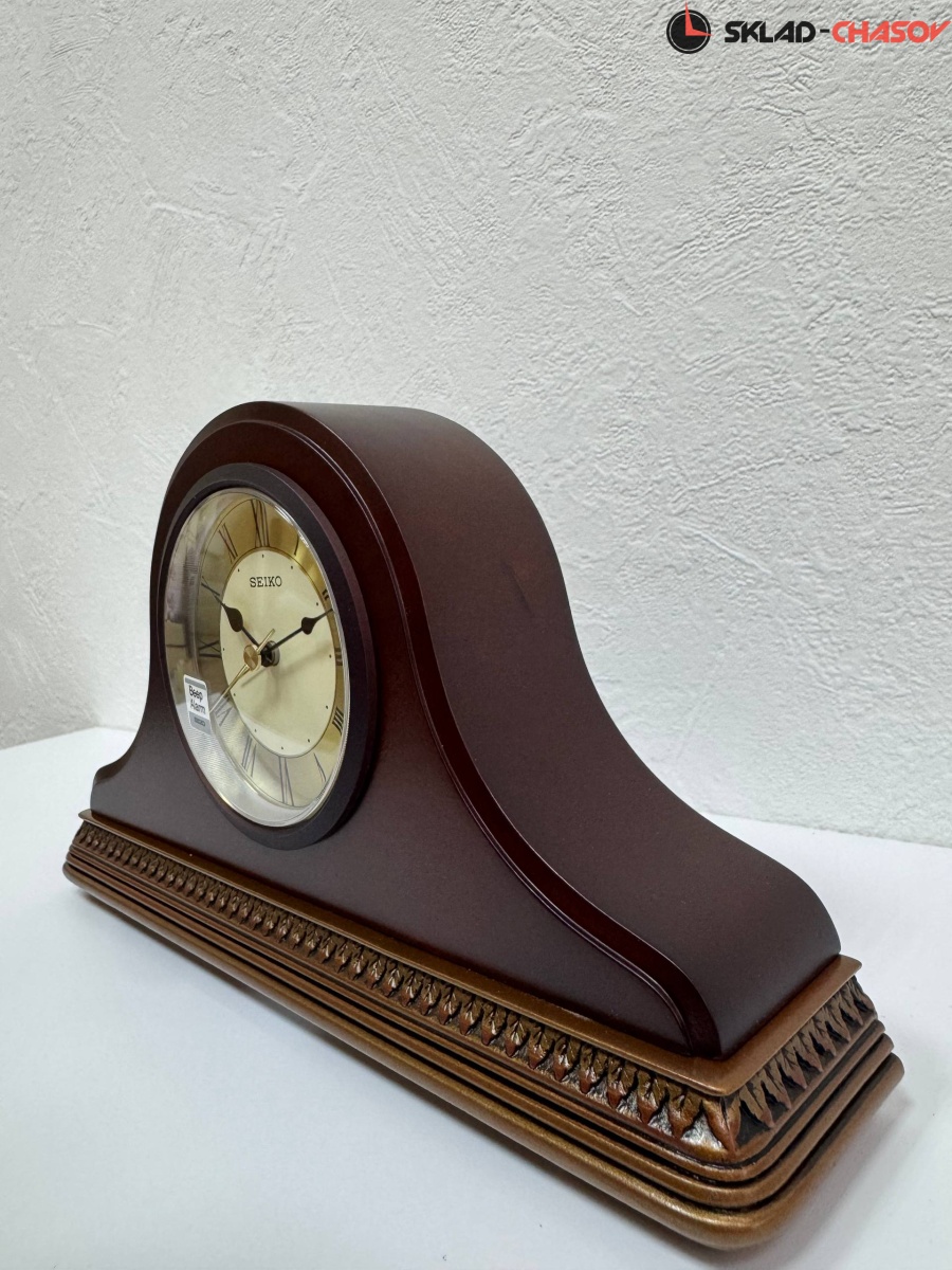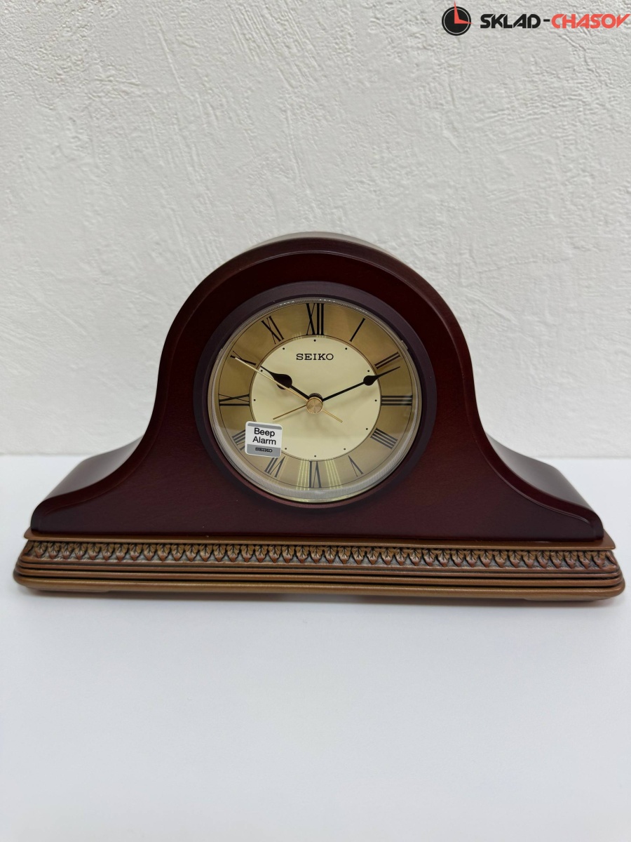 Настольные кварцевые часы-будильник с аналоговым циферблатом (стрелки). Стрелки: черная часовая, черная минутная и золотистая секундная. Белый циферблат с золотистым диском и черными римскими цифрами. Корпус выполнен из дерева.