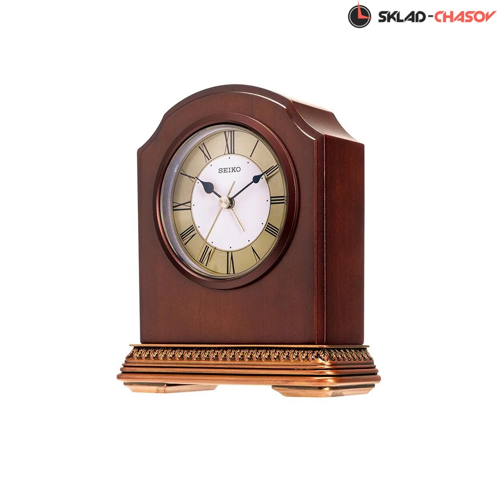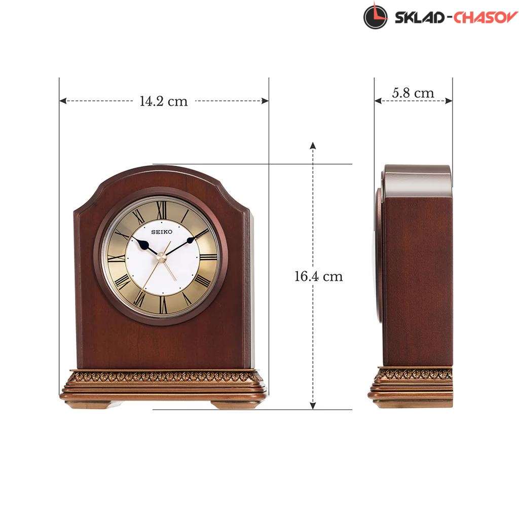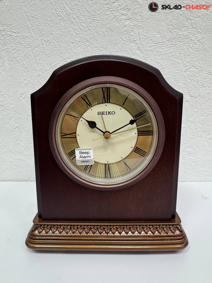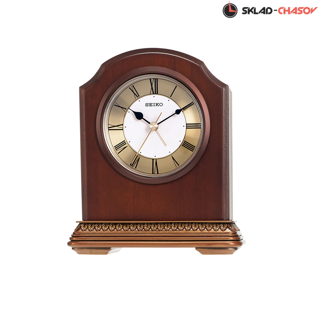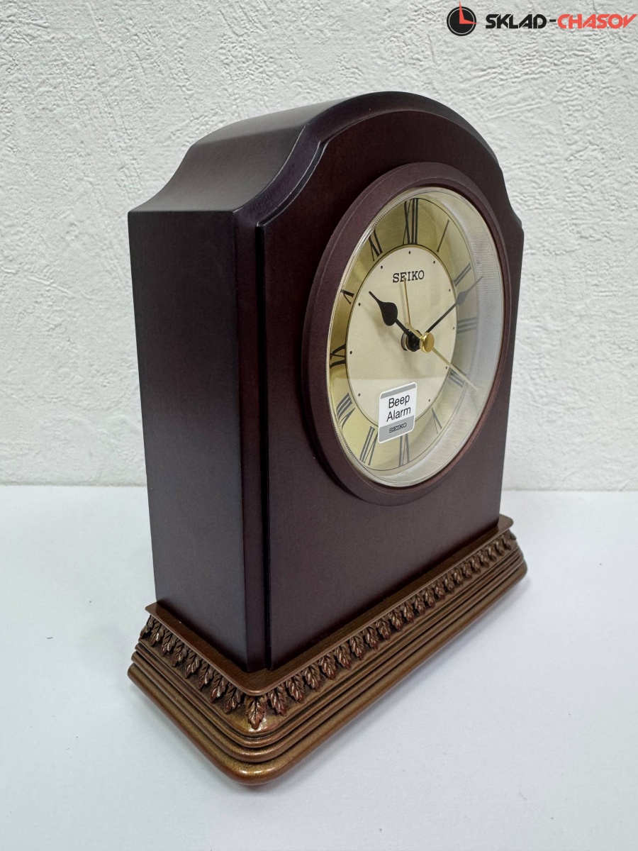 SEIKO QXE018BN - настольные часы с кварцевым механизмом, который отличается точностью, надежностью, не боится ударов и не требует подзавода. Корпус выполнен из качественного дерева (ольха) - этот материал прослужит Вам долгие годы и сохранит свой первоначальный вид. Классический круглый циферблат бело-золотистого цвета, часовая, минутная и секундная стрелки. Будильник. Временные рамки обозначены большими римскими цифрами - Вы с легкостью определите текущее время. Настольные часы SEIKO отлично впишутся в Ваш интерьер.
