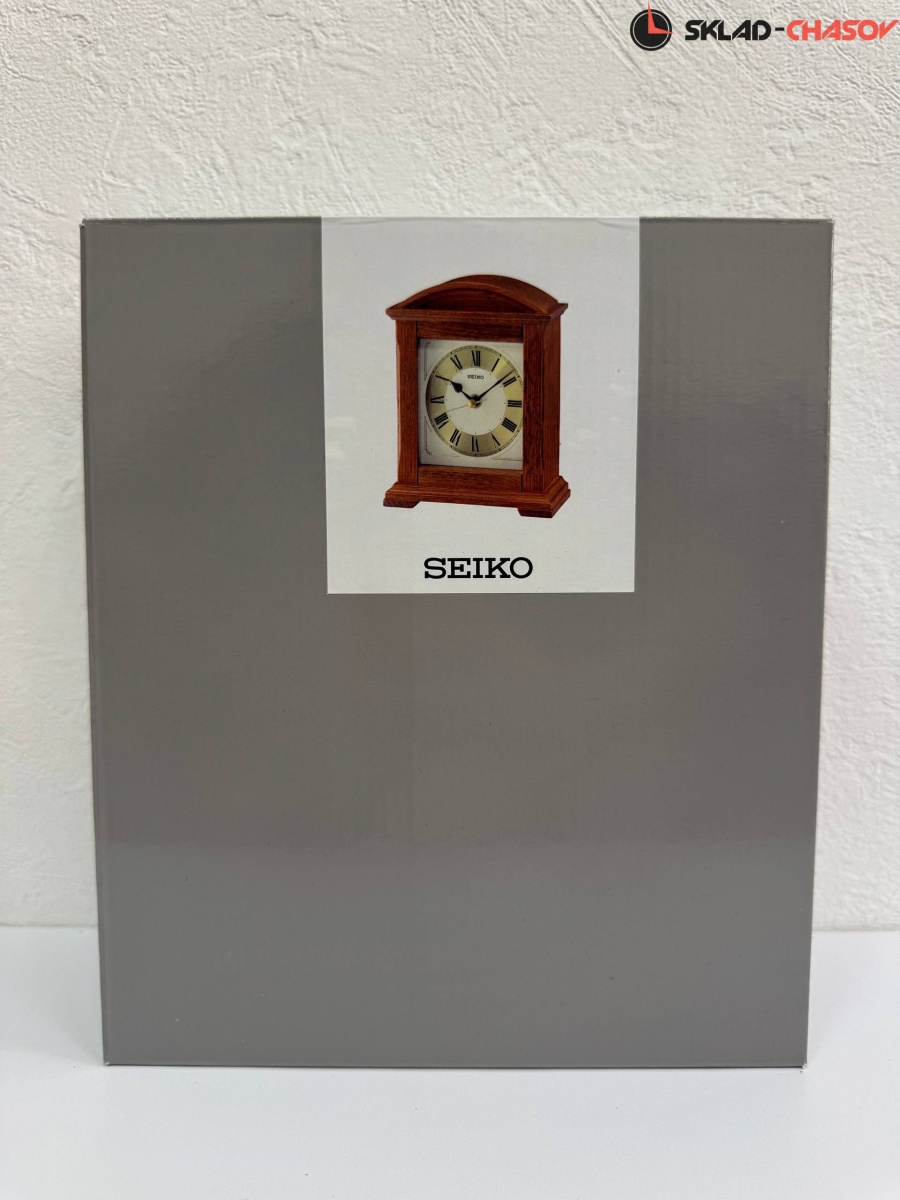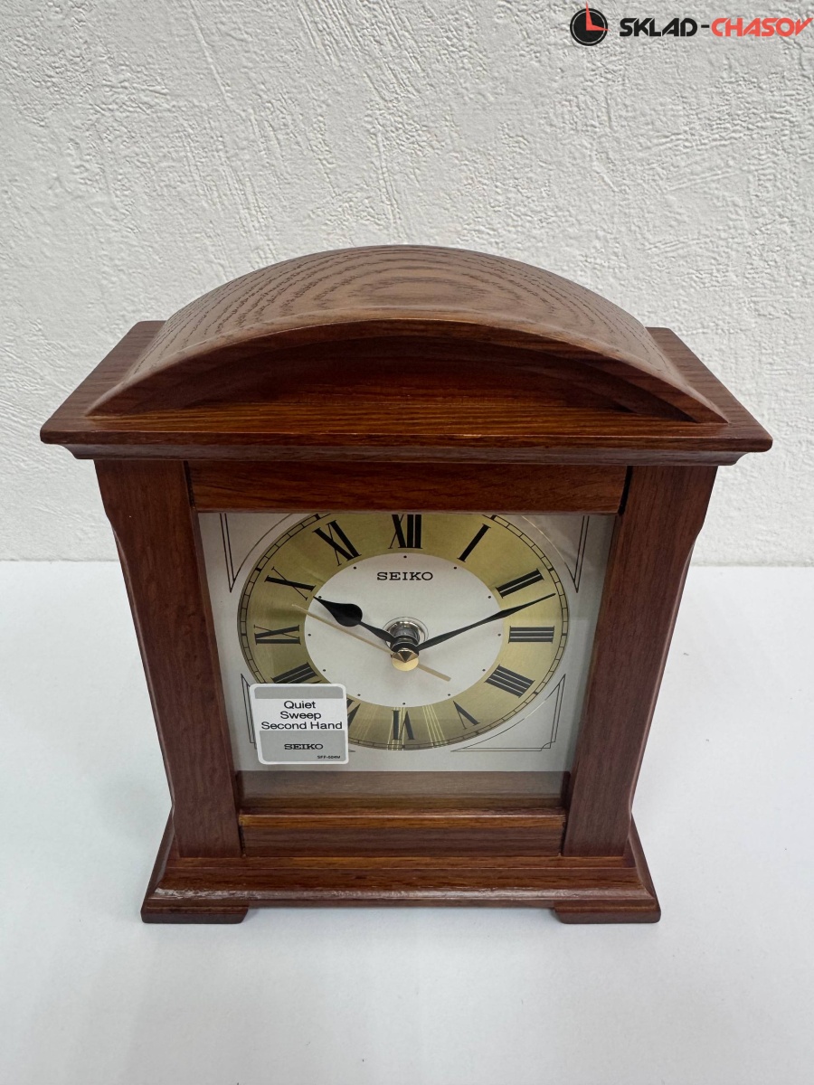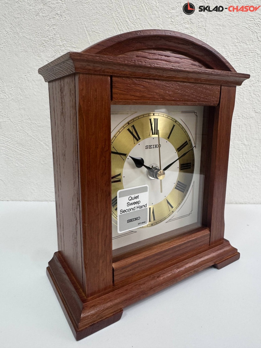 Кварцевые настольные часы из дерева SEIKO QXG123B с аналоговым циферблатом (стрелки). Стрелки: черная часовая, черная минутная и золотистая секундная. Циферблат золотистого цвета с римскими цифрами. Корпус выполнен из дерева (дуб).