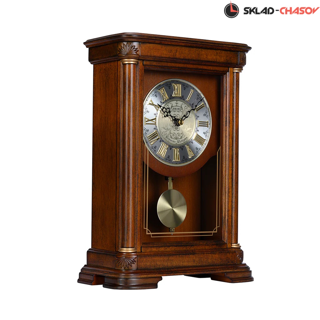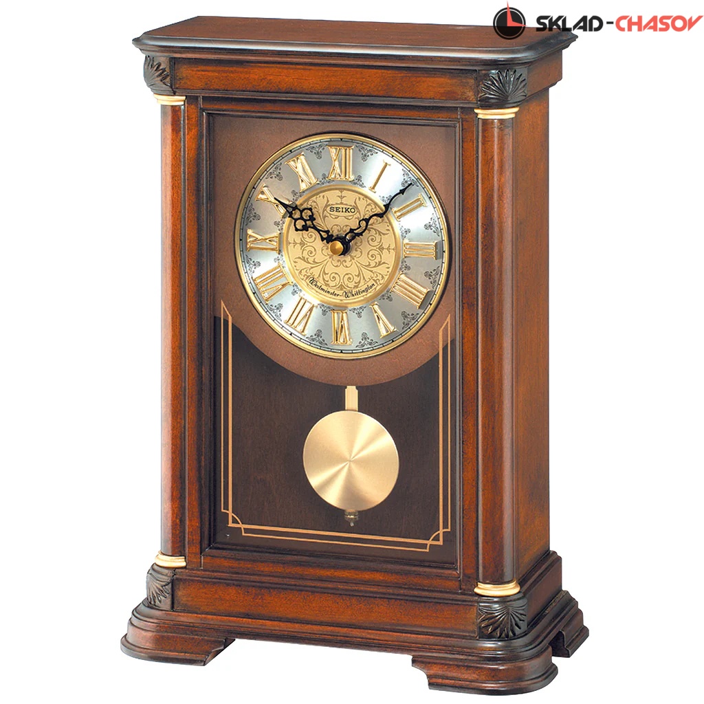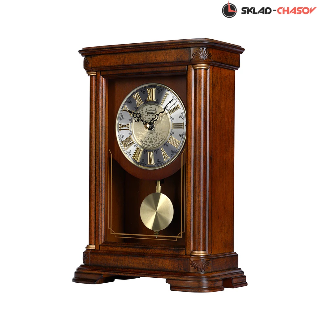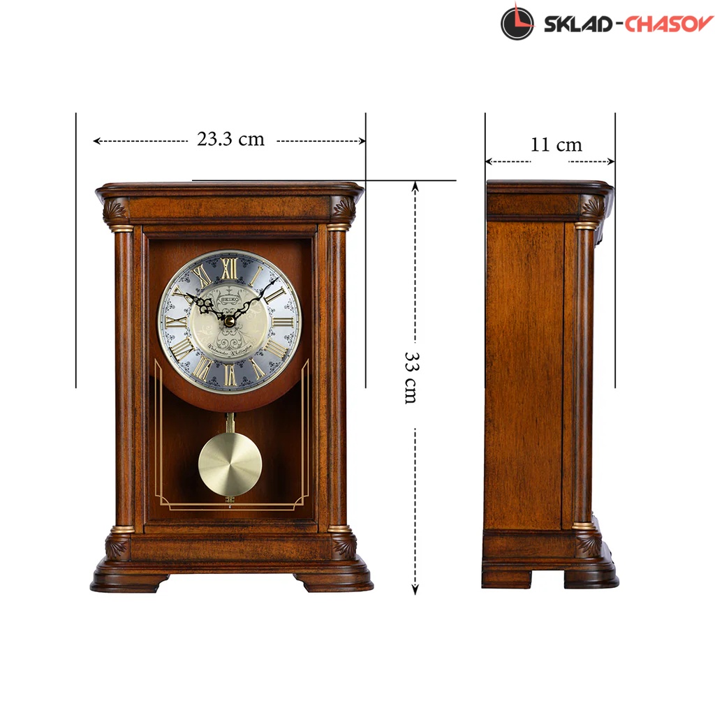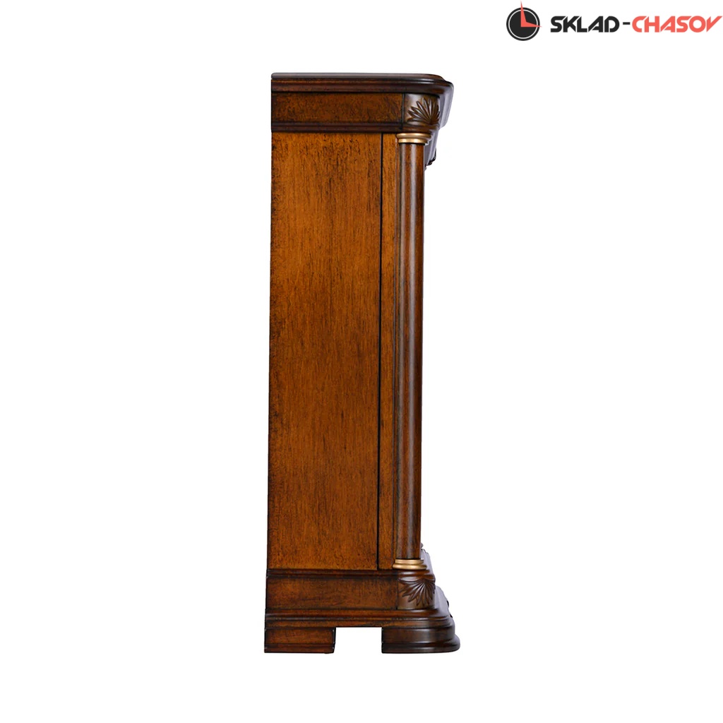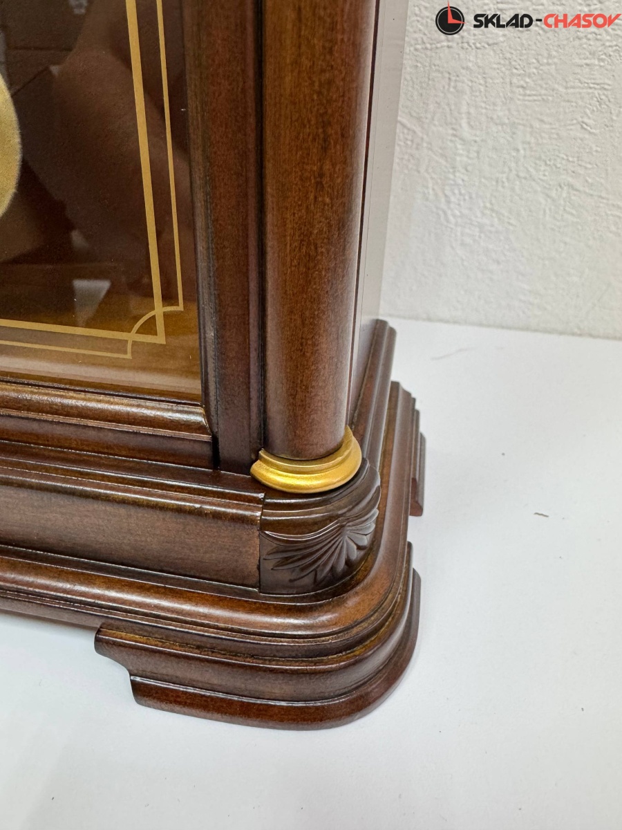 Коричневые кварцевые настольные часы с аналоговым циферблатом (стрелки). Стрелки: черная часовая, черная минутная. Циферблат серебристый с золотистыми римскими цифрами. Ниже циферблата расположился маятник. Две мелодии на выбор Westminster/Whittington. Бой каждые 15 минут по четвертям. Ровно в час полная мелодия и бой по количеству часов. Регулятор громкости. Автоматическое отключение звука на ночь. Корпус выполнен из дерева. Бесшумный механизм.