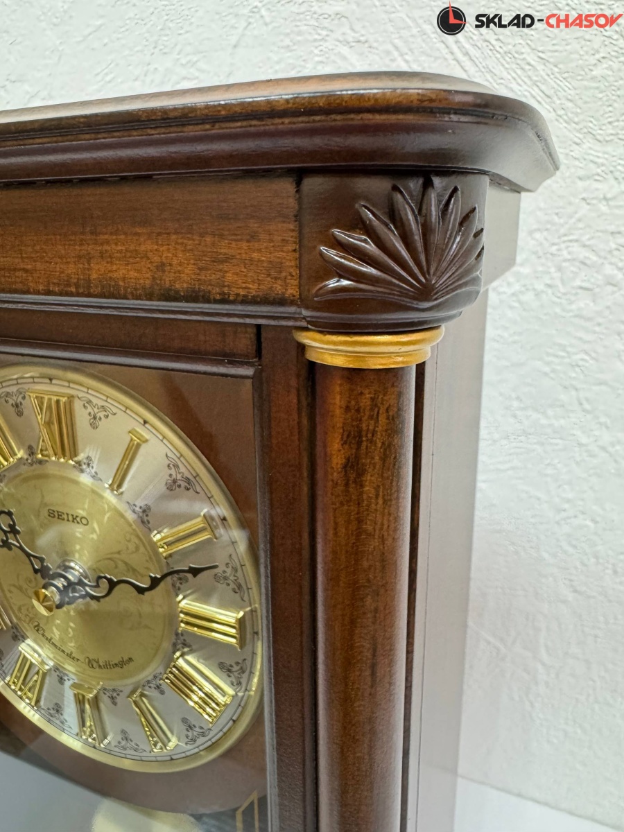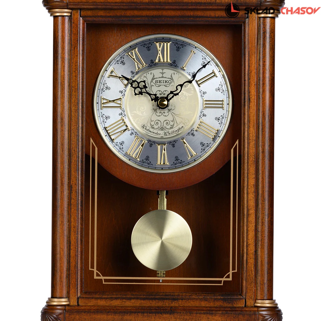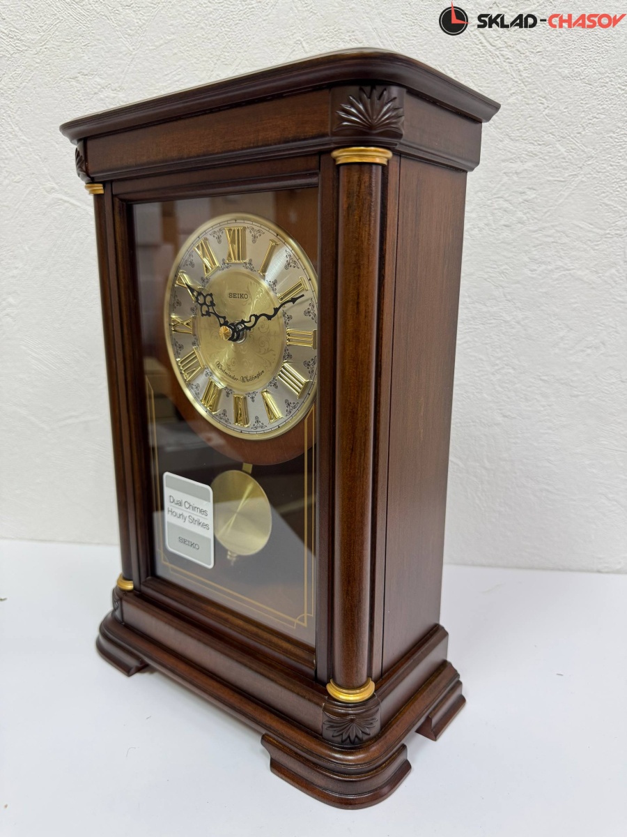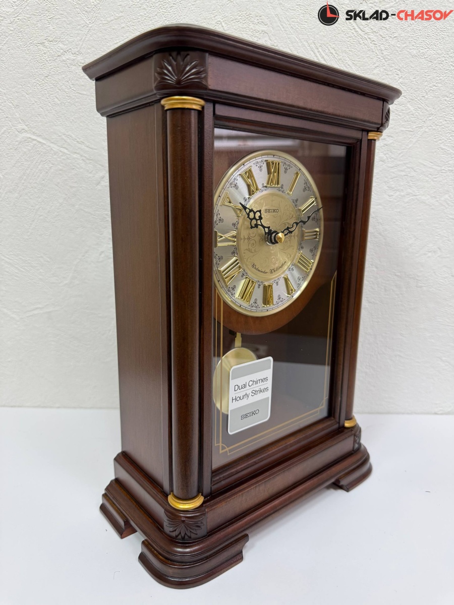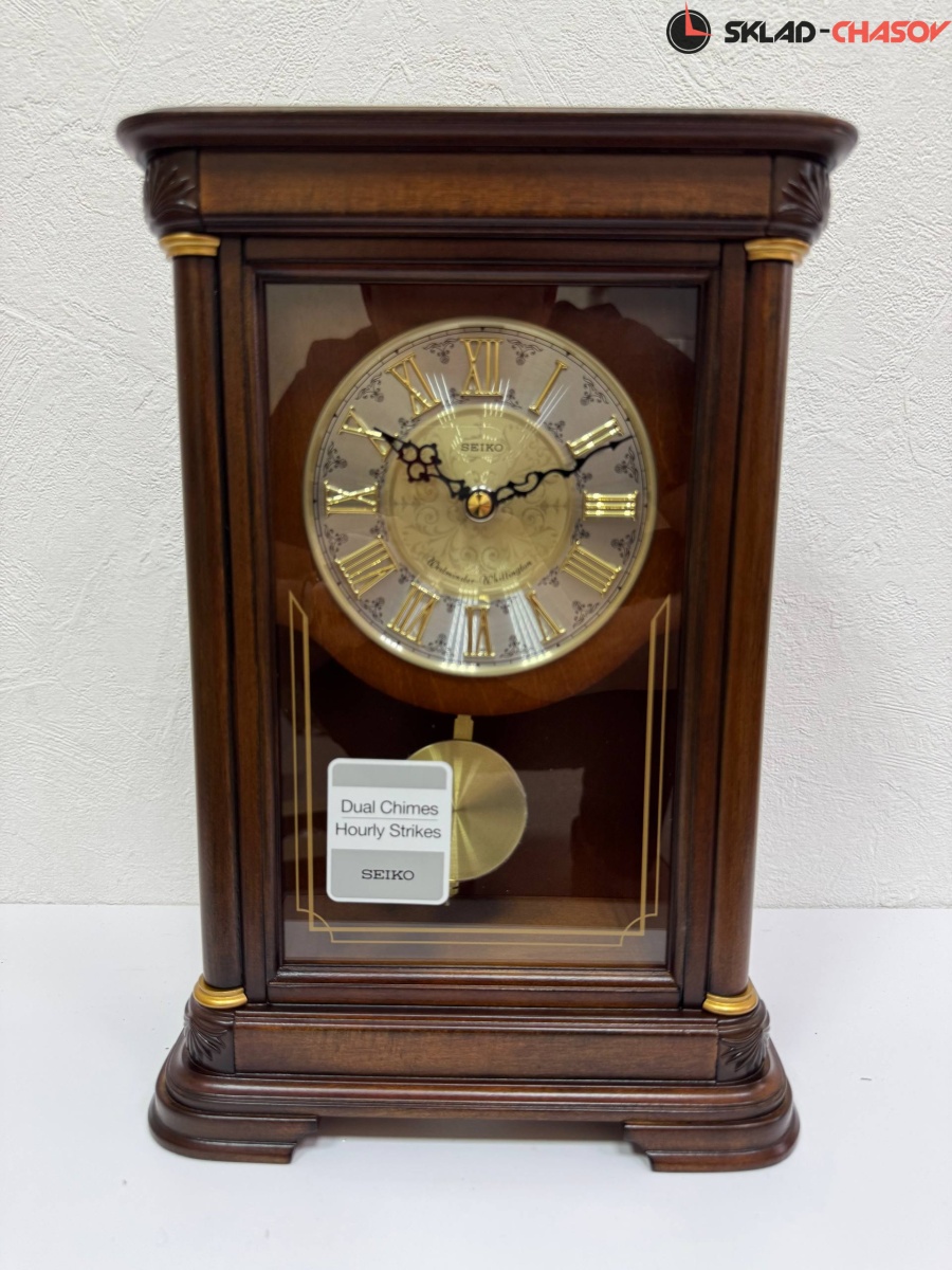 Коричневые кварцевые настольные часы с аналоговым циферблатом (стрелки). Стрелки: черная часовая, черная минутная. Циферблат серебристый с золотистыми римскими цифрами. Ниже циферблата расположился маятник. Две мелодии на выбор Westminster/Whittington. Бой каждые 15 минут по четвертям. Ровно в час полная мелодия и бой по количеству часов. Регулятор громкости. Автоматическое отключение звука на ночь. Корпус выполнен из дерева. Бесшумный механизм.