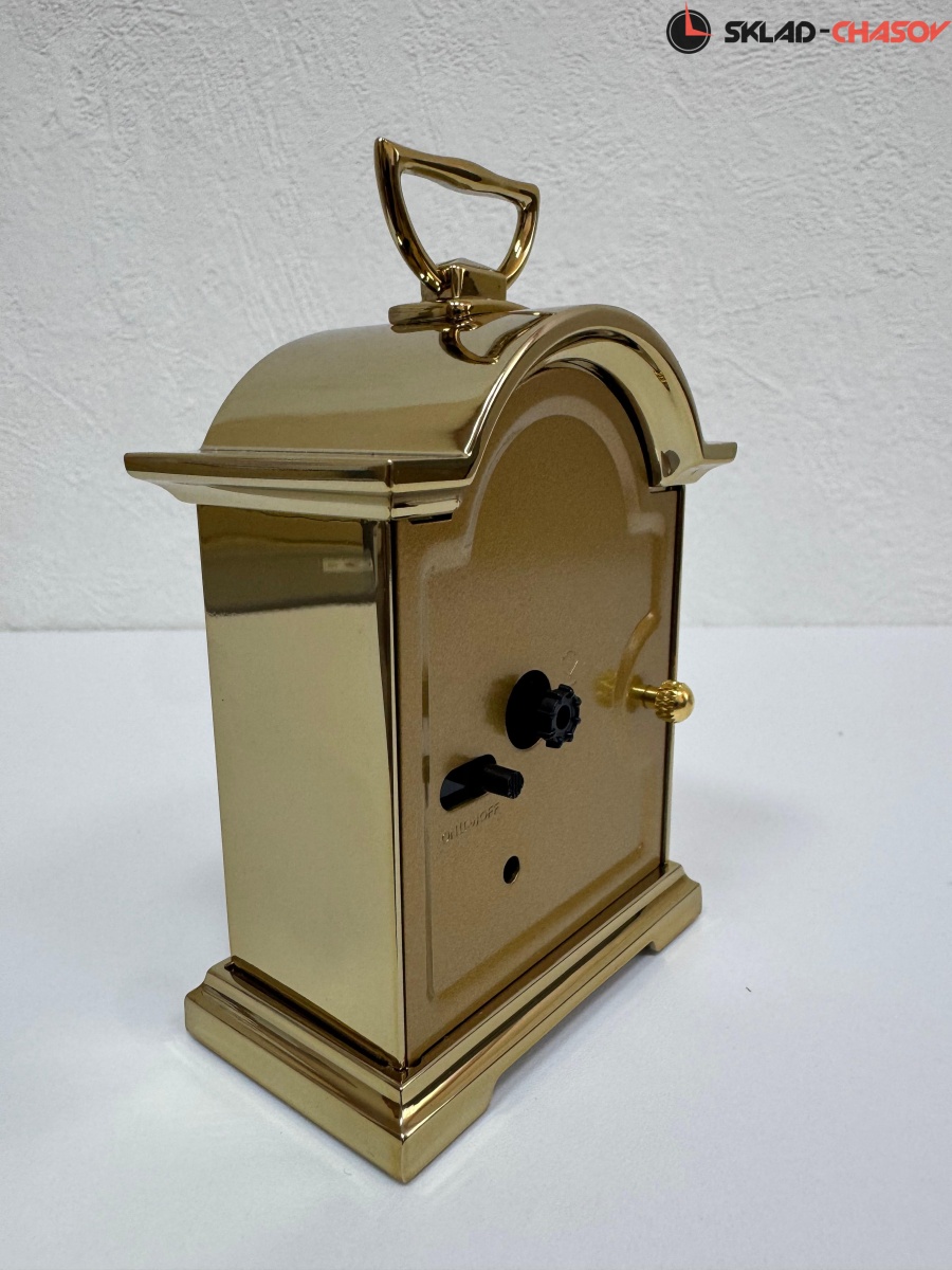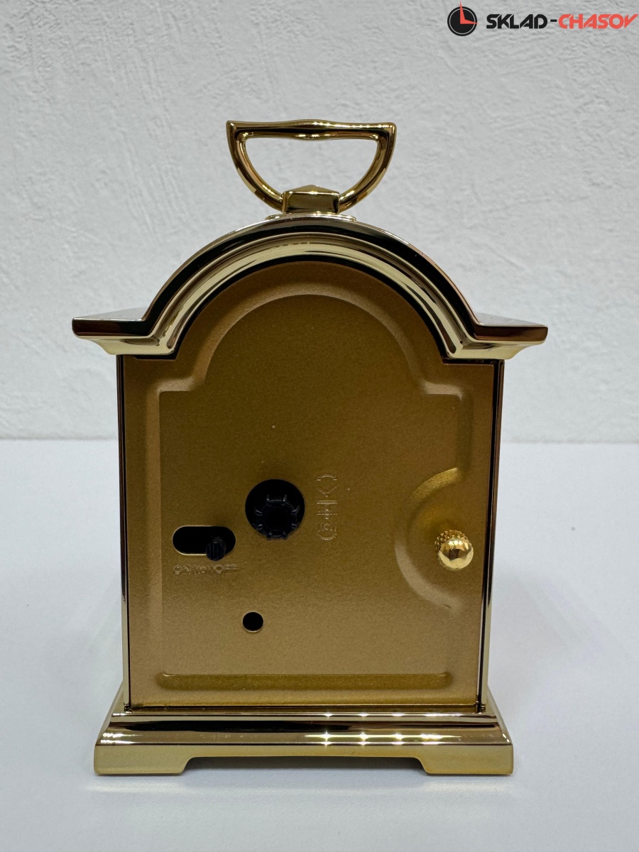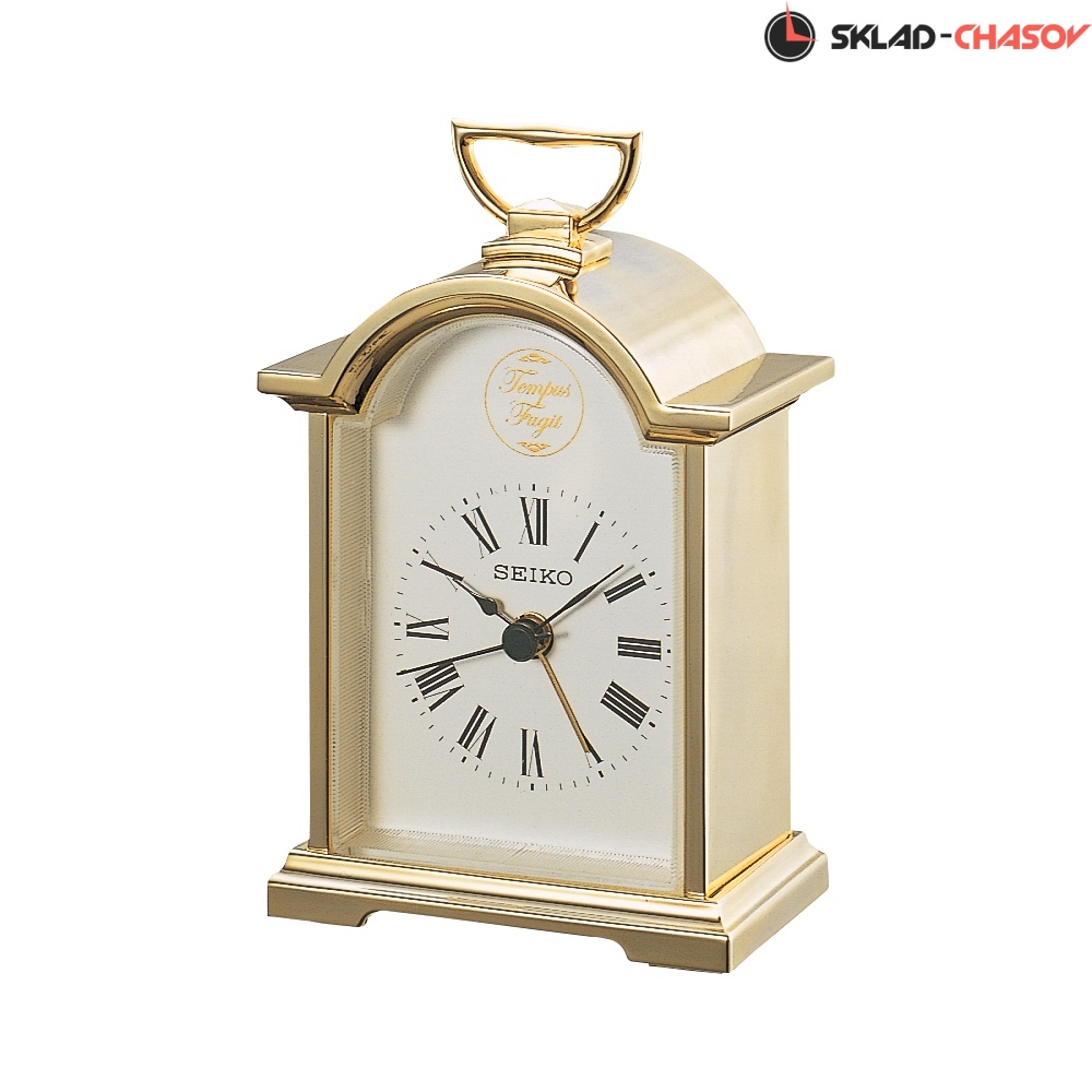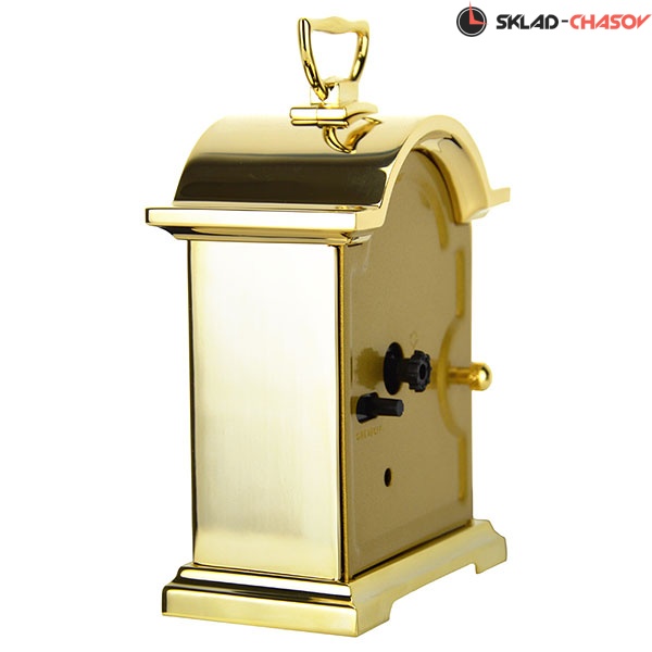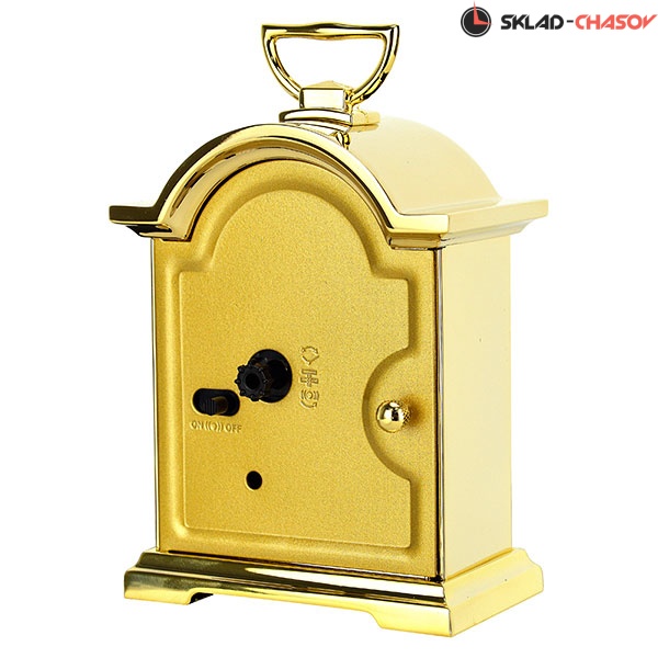 Золотистые настольные кварцевые часы-будильник с аналоговым циферблатом (стрелки). Стрелки: черная часовая, черная минутная и черная секундная. Белый циферблат с римскими цифрами, закрыт стеклом. Стекло: минеральное. Плавный ход секундной стрелки. Бесшумный механизм. Корпус выполнен из металла.