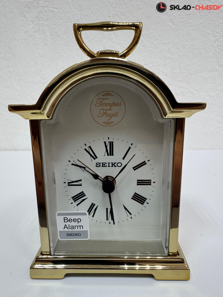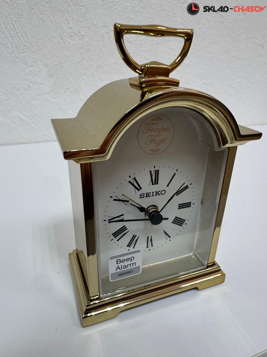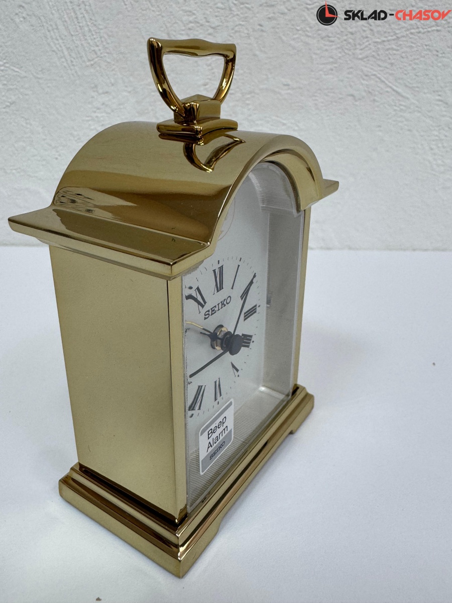 Золотистые настольные кварцевые часы-будильник с аналоговым циферблатом (стрелки). Стрелки: черная часовая, черная минутная и черная секундная. Белый циферблат с римскими цифрами, закрыт стеклом. Стекло: минеральное. Плавный ход секундной стрелки. Бесшумный механизм. Корпус выполнен из металла.