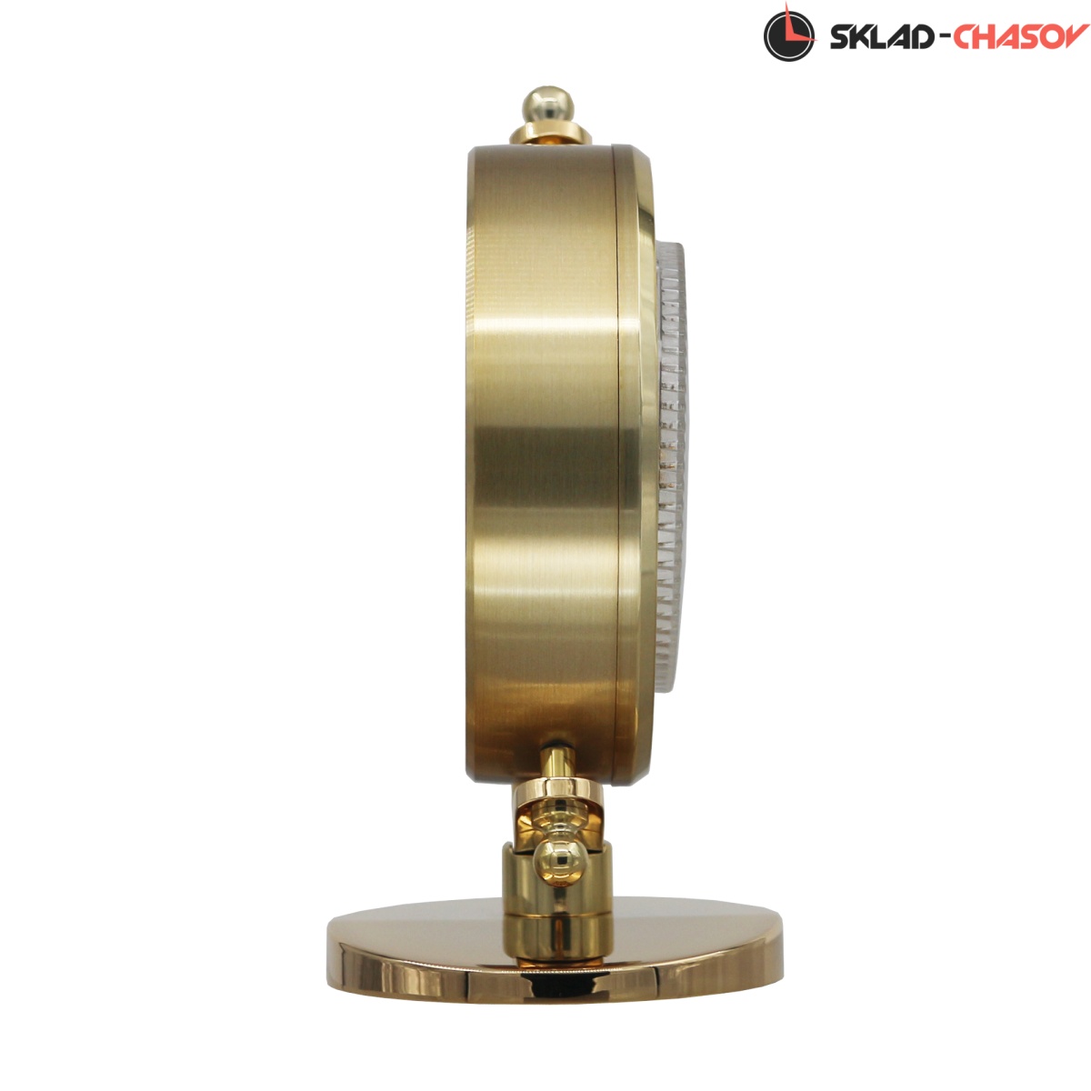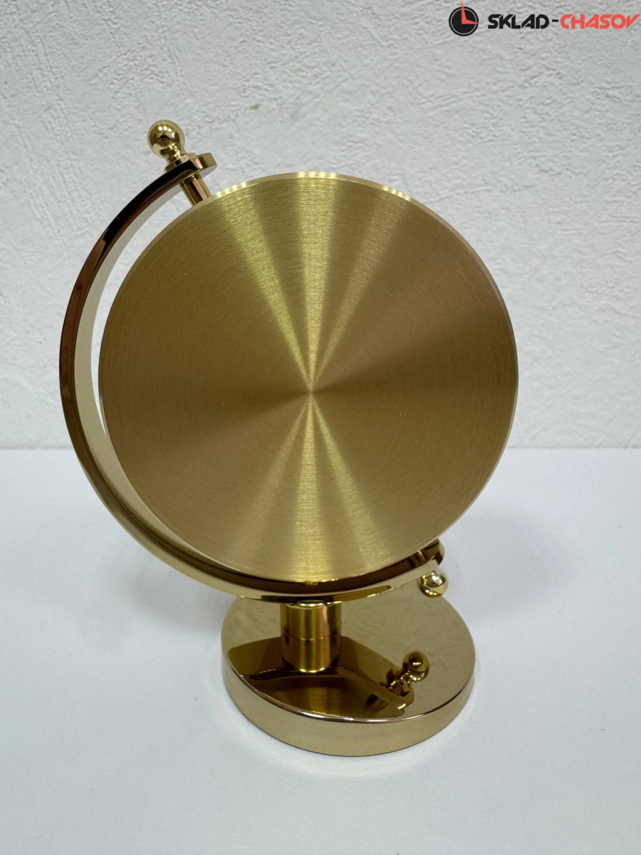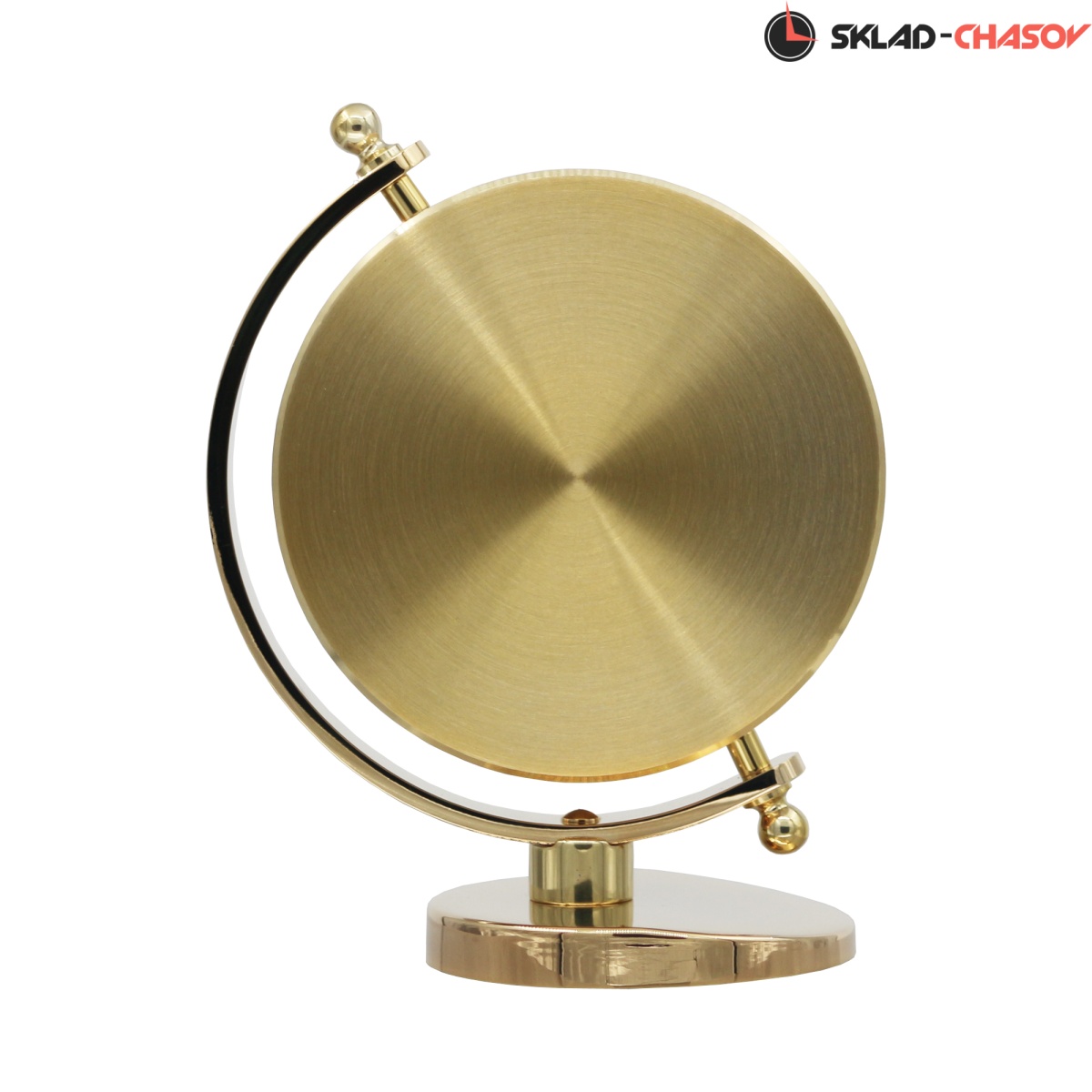 Золотистые настольные кварцевые часы с аналоговым циферблатом (стрелки). Стрелки: золотистая часовая, золотистая минутная и золотистая секундная. Черный циферблат с картой мира. На циферблате расположились арабские цифры. Плавный ход секундной стрелки. Бесшумный механизм. Корпус выполнен из латуни. Центральная часть крутится, позволяя выставить разные часовые пояса.