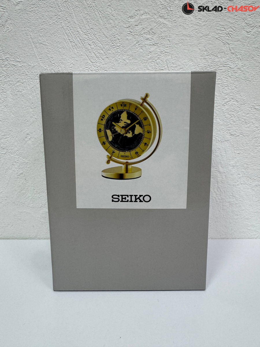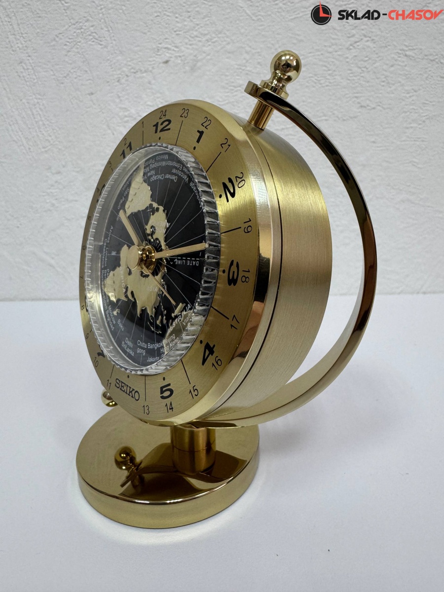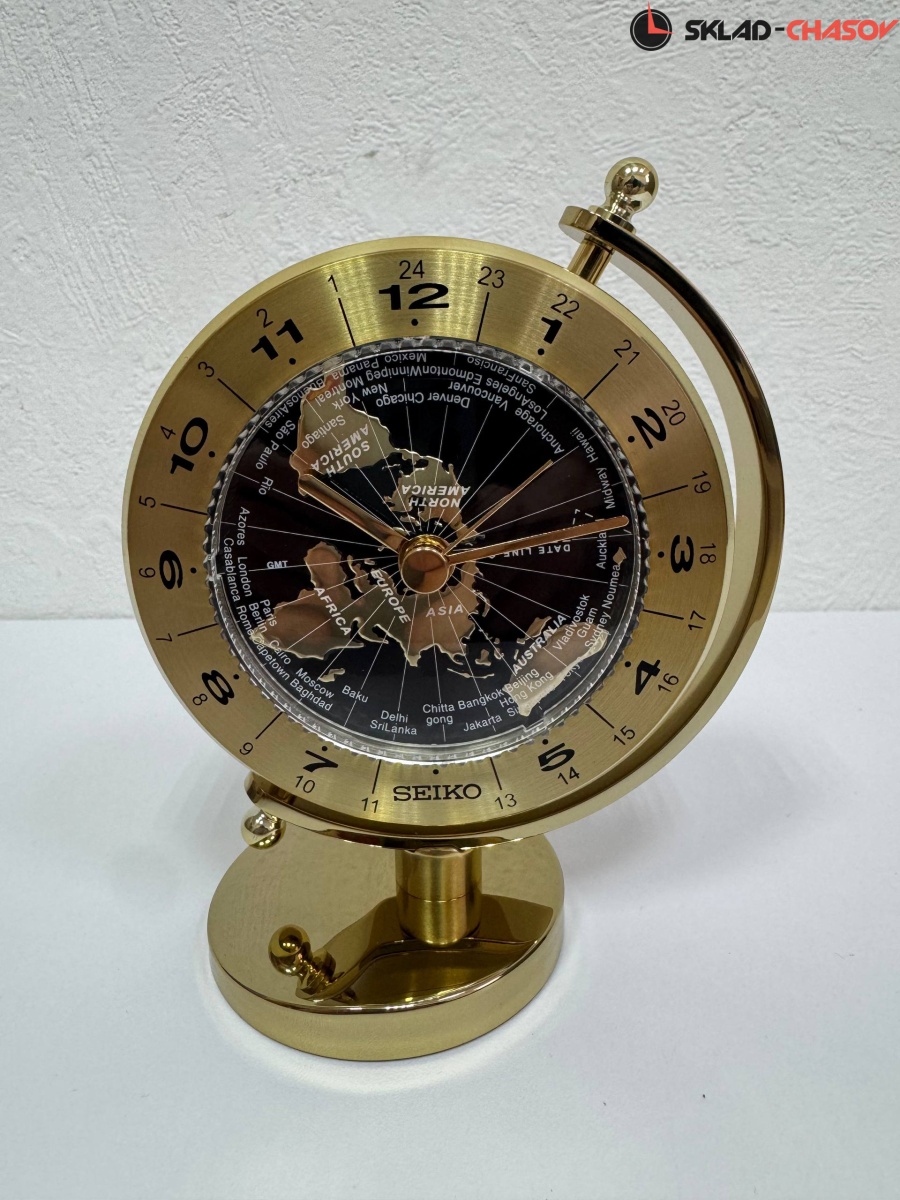 Золотистые настольные кварцевые часы с аналоговым циферблатом (стрелки). Стрелки: золотистая часовая, золотистая минутная и золотистая секундная. Черный циферблат с картой мира. На циферблате расположились арабские цифры. Плавный ход секундной стрелки. Бесшумный механизм. Корпус выполнен из латуни. Центральная часть крутится, позволяя выставить разные часовые пояса.