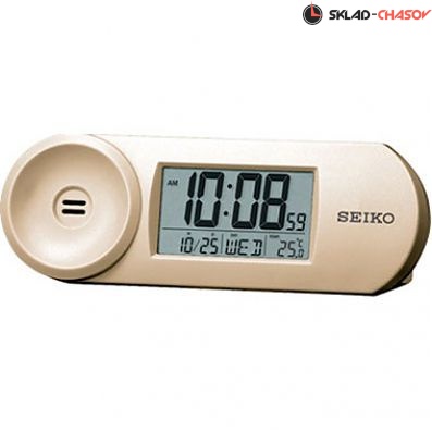 Настольные многофункциональные часы в пластиковом корпусе бежевого цвета, отображающие температуру и оснащенные календарем. Кварцевый цифровой будильник, календарь, термометр, подсветка, повтор сигнала.