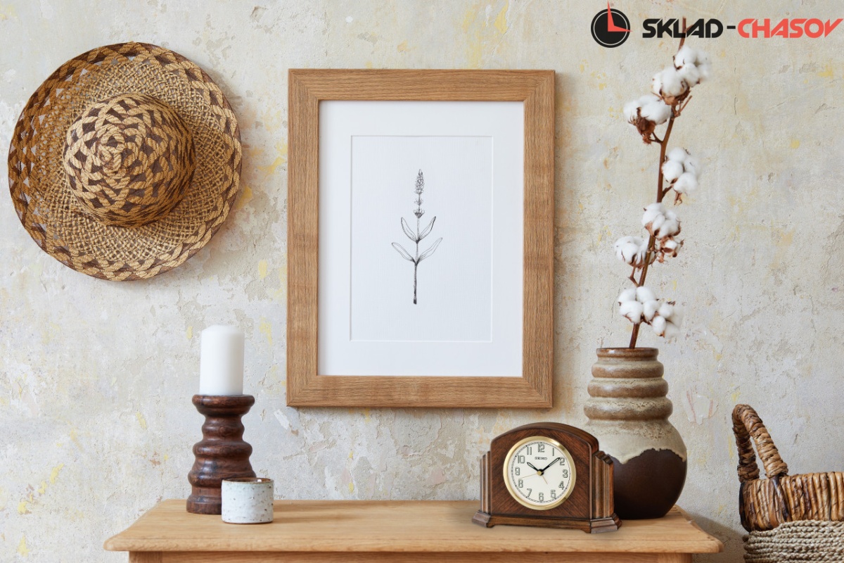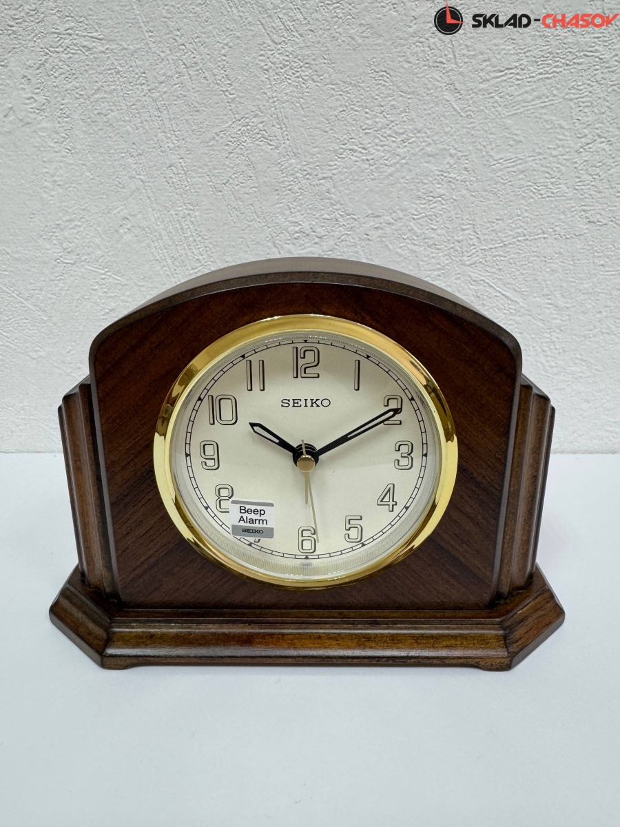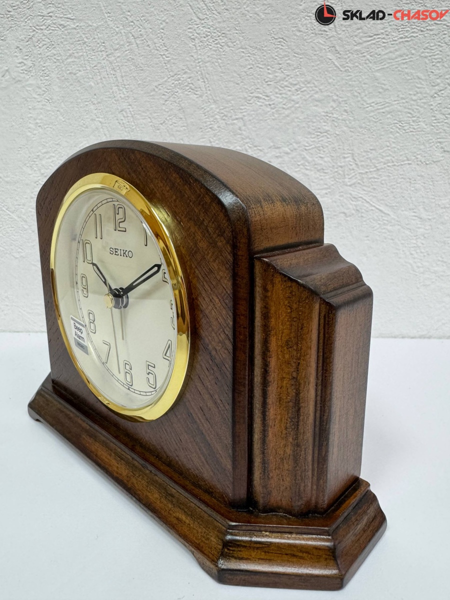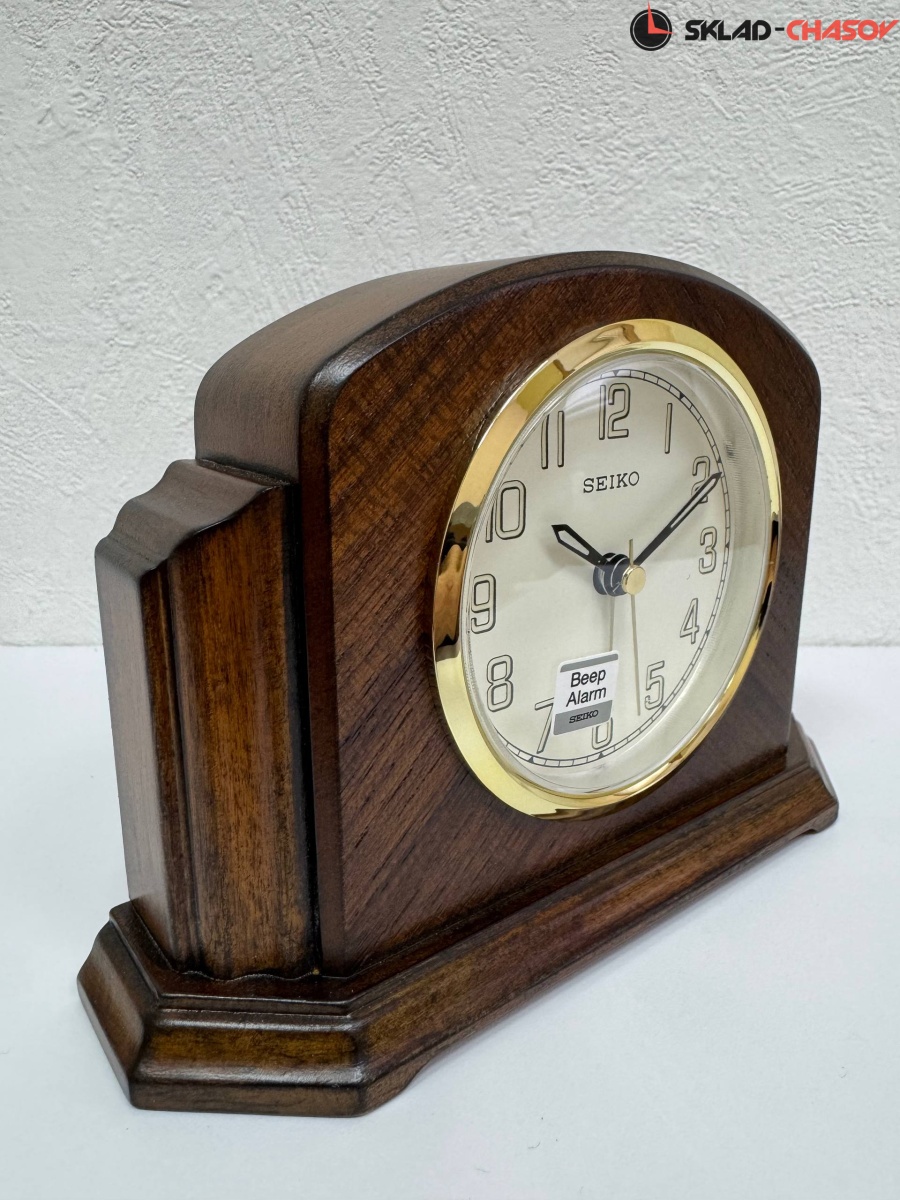 Настольные кварцевые часы-будильник с аналоговым циферблатом (стрелки). Стрелки: черная часовая, черная минутная и золотистая секундная. Белый циферблат и черными арабскими цифрами. На цифры и стрелки нанесена люминесцентная подсветкой LumiBrite. Корпус выполнен из дерева, шпонирован тиковым деревом.