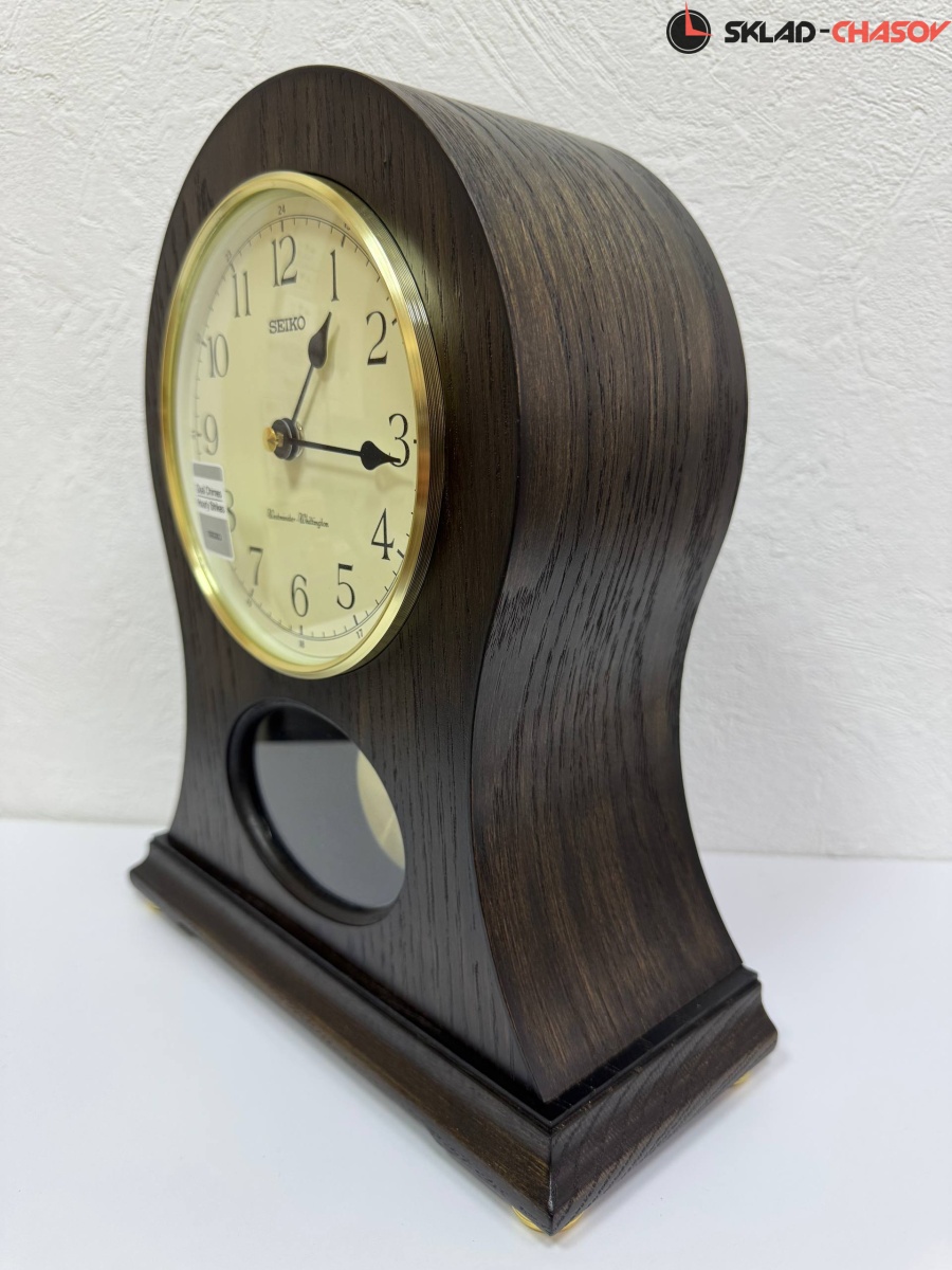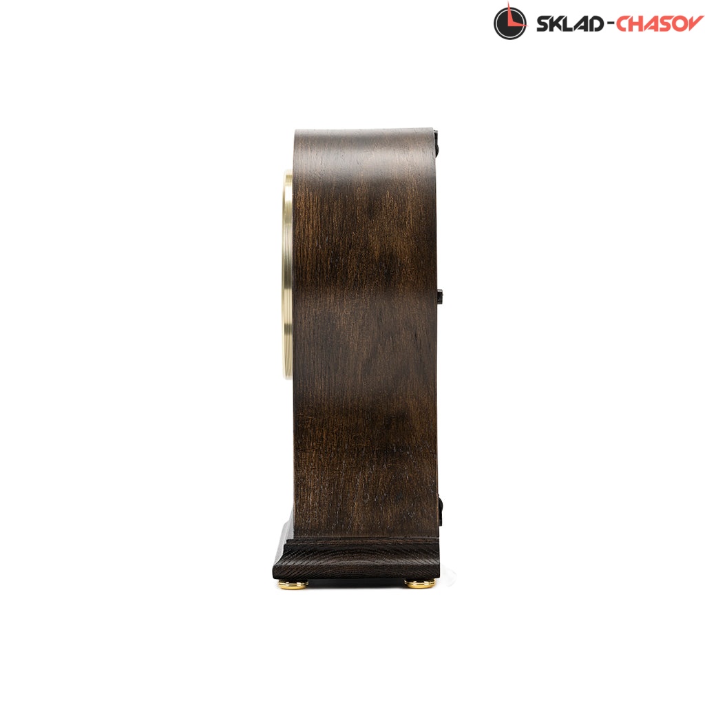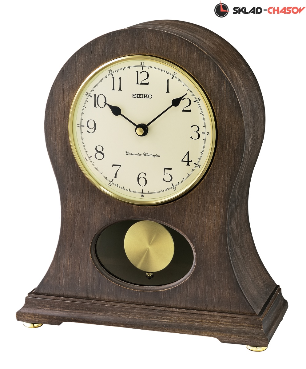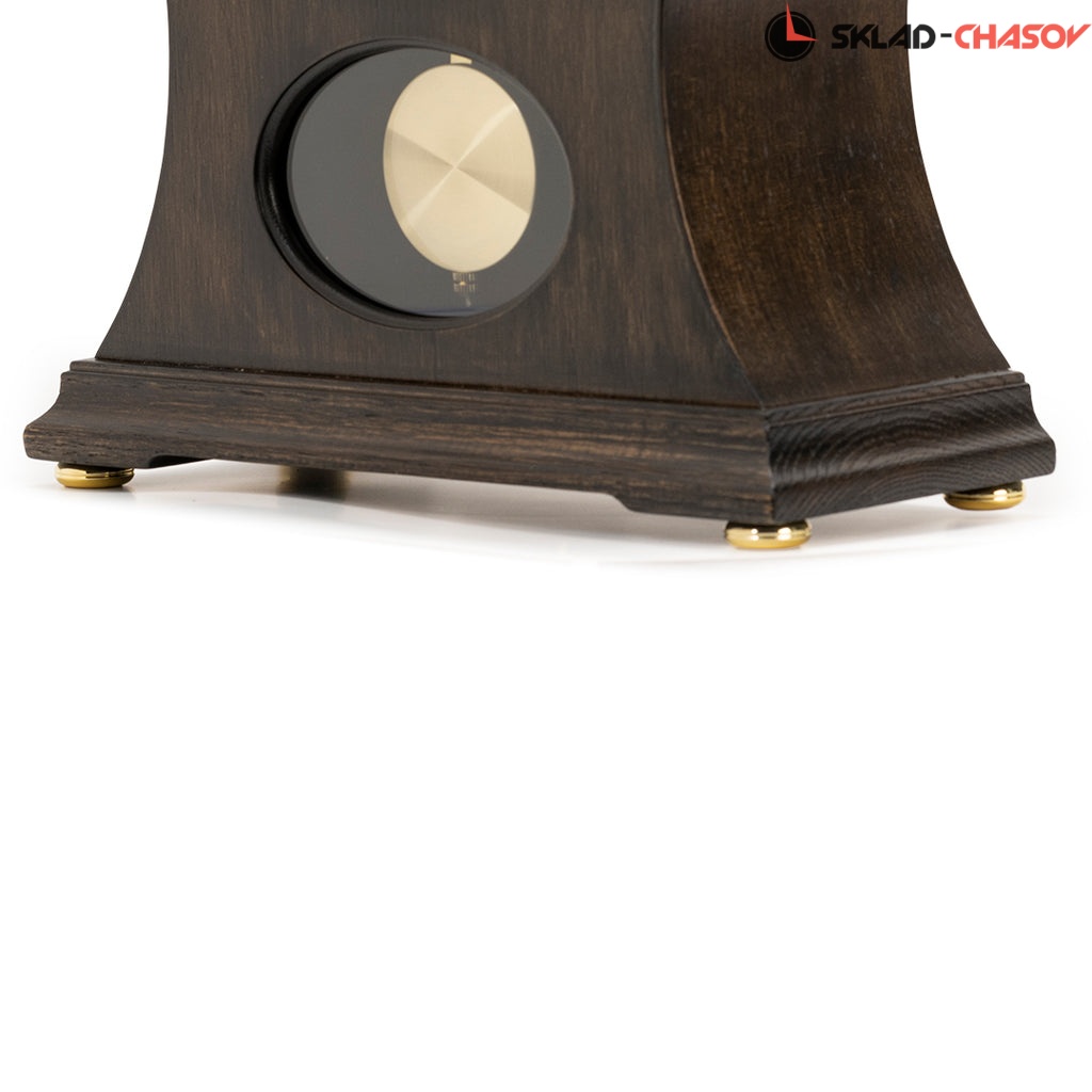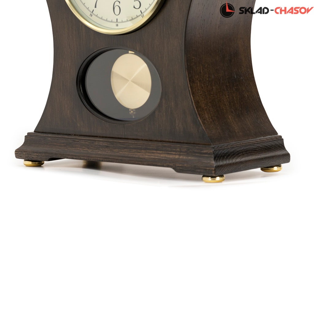 Коричневые кварцевые настольные часы с аналоговым циферблатом (стрелки). Стрелки: черная часовая, черная минутная. Циферблат бежевый с арабскими цифрами. Ниже циферблата расположился маятник. Две мелодии на выбор Westminster/Whittington. Регулятор громкости. Автоматическое отключение звука на ночь. Корпус выполнен из дерева. Бесшумный механизм.