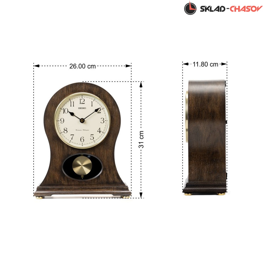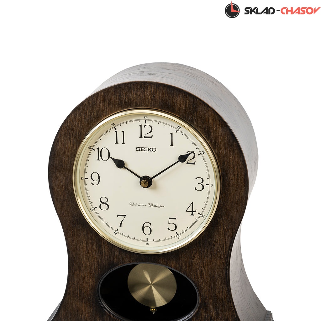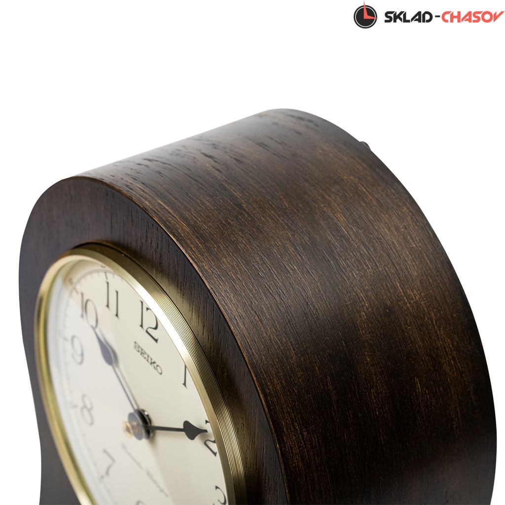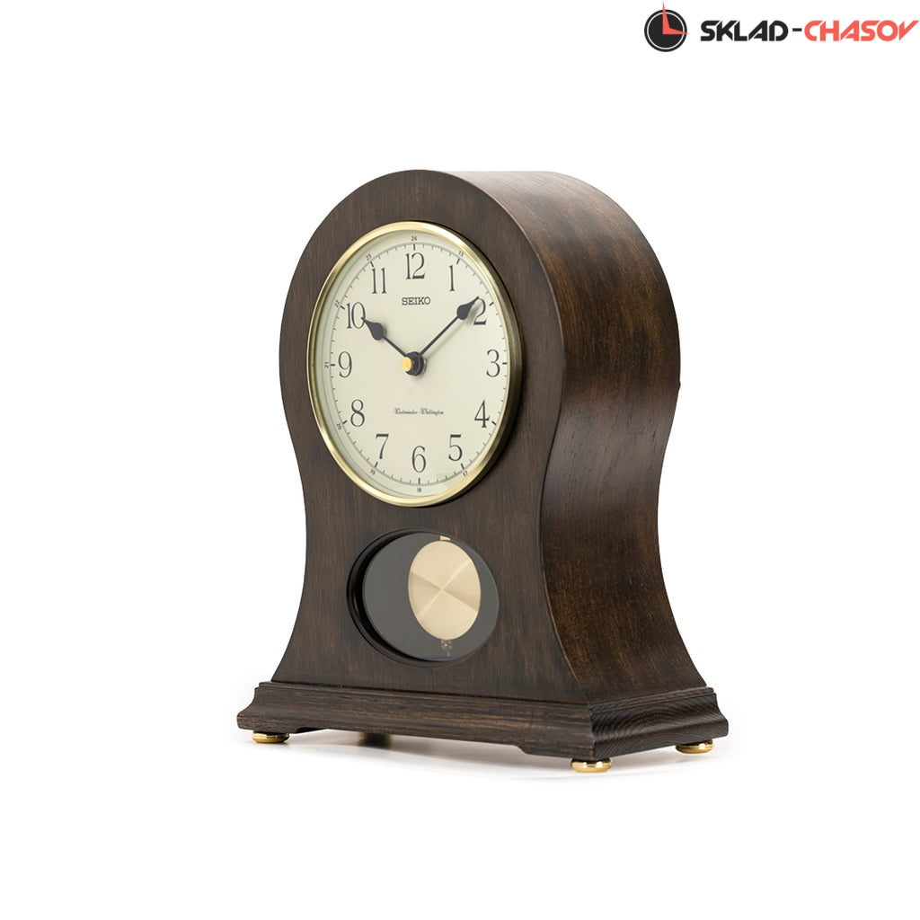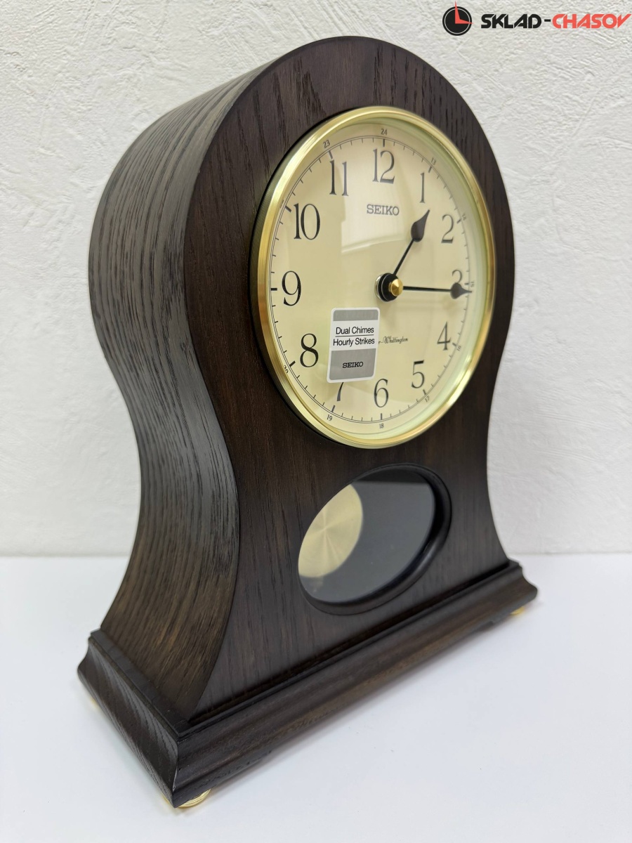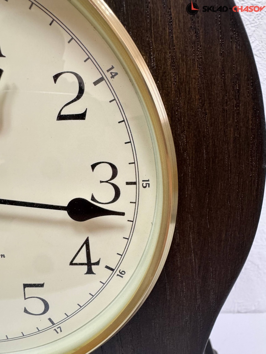 Коричневые кварцевые настольные часы с аналоговым циферблатом (стрелки). Стрелки: черная часовая, черная минутная. Циферблат бежевый с арабскими цифрами. Ниже циферблата расположился маятник. Две мелодии на выбор Westminster/Whittington. Регулятор громкости. Автоматическое отключение звука на ночь. Корпус выполнен из дерева. Бесшумный механизм.