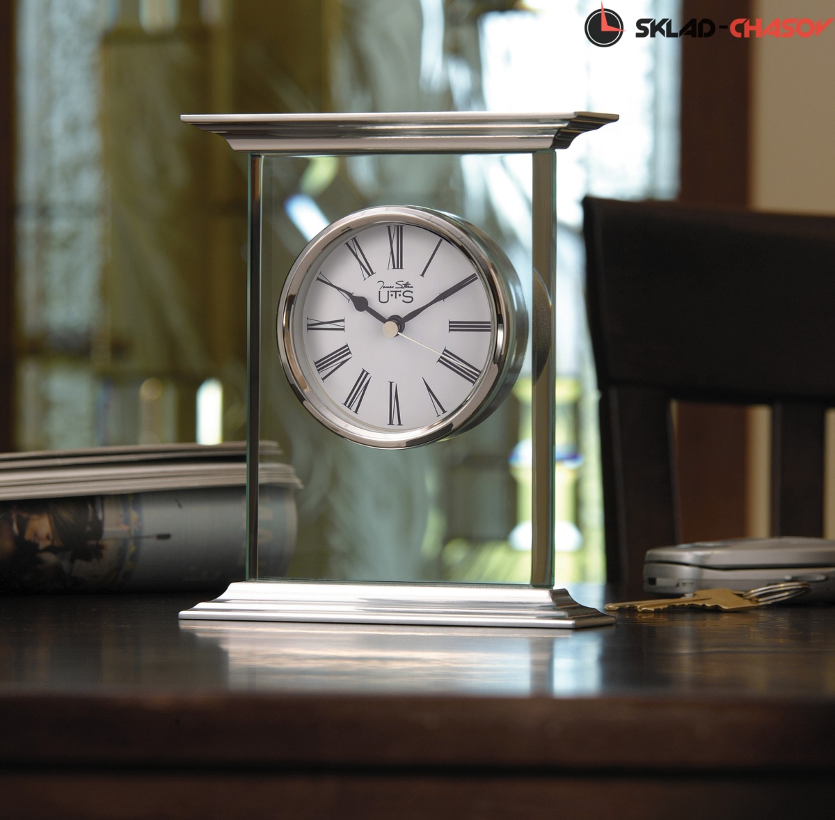 Кварцевые настольные часы. Корпус из стекла и металла. Циферблат закрыт стеклом. На основание часов наклеены фетровые накладки для сохранности поверхности, на которой Вы планируете разместить часы. Питание от одной батарейки типа АА (Входит в поставку).