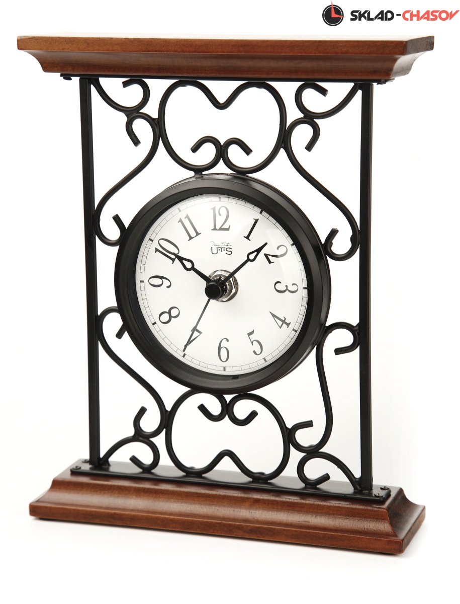 Кованые металлические настольные часы, выполнены в черном цвете. Основание и верхняя панель часов из массива дерева, с отделкой под вишню. Белый циферблат, черные арабские цифры. Циферблат закрыт акриловым стеклом. Кварцевый механизм Young Town (Гонконг). Требуется 1 батарейка типа АА (не включена в поставку).