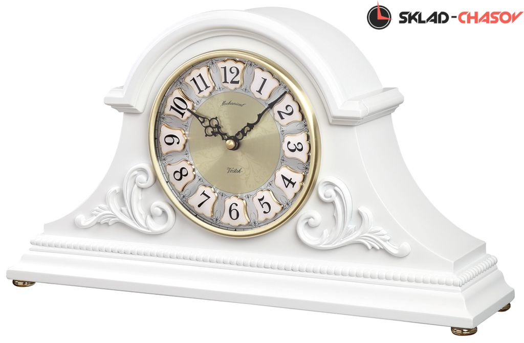 Корпус настольных механических часов МТ-2279-10 с семисуточным заводом изготовлен из ольхи и покрыт лаком белого цвета. Циферблат алюминиевый с инкрустацией золотого цвета и крупными арабскими цифрами на белом эмалевом поле. Красочная упаковочная коробка идеально подойдет для подарка на праздник.