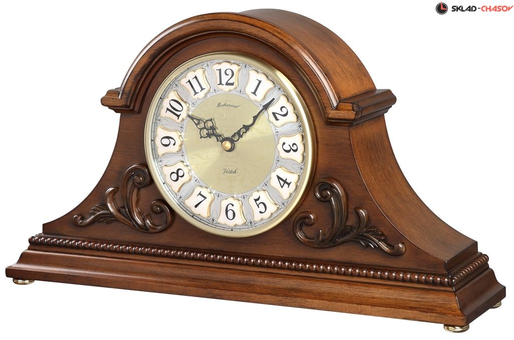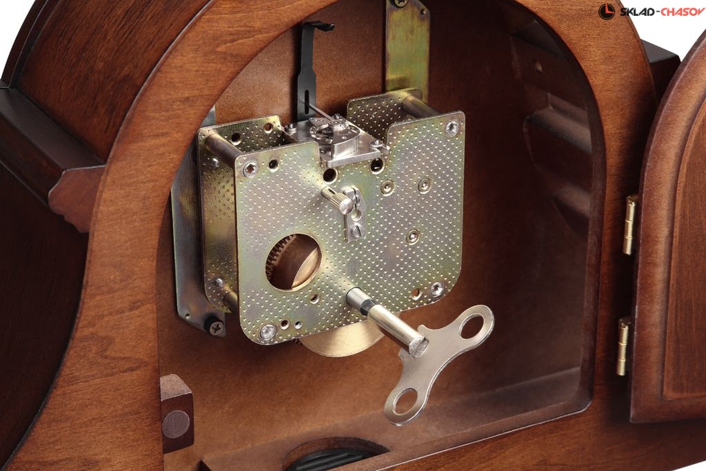 Корпус настольных механических часов МТ-2279-2НС с семисуточным заводом изготовлен из ольхи и покрыт лаком коричневого цвета HAMPTON CHERRY(коричневый с "переливами").