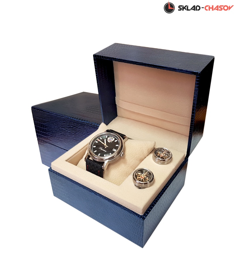 Футляр из искусственной кожи тёмно-синего цвета с рисунком, имитирующим кожу крокодила. Подарочный набор с моделью часов 8235/303.1.184 и запонок.
