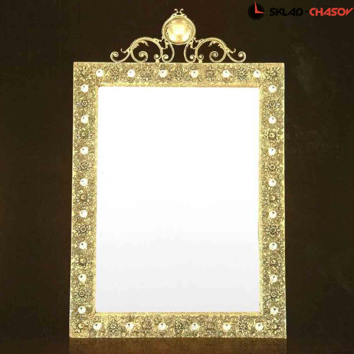 Художественное оформление традиционно прямоугольного зеркала — в точном соответствии ювелирным канонам Востока. Классическое рамочное обрамление по всему периметру дополнено изысканным геометрическим декором верхней части. Симметричная узорчатая вязь и центральный круглый элемент-медальон добавляют утонченности и поражают филигранной точностью: работа 100% ручная, по технологии с 1000 летней историей!