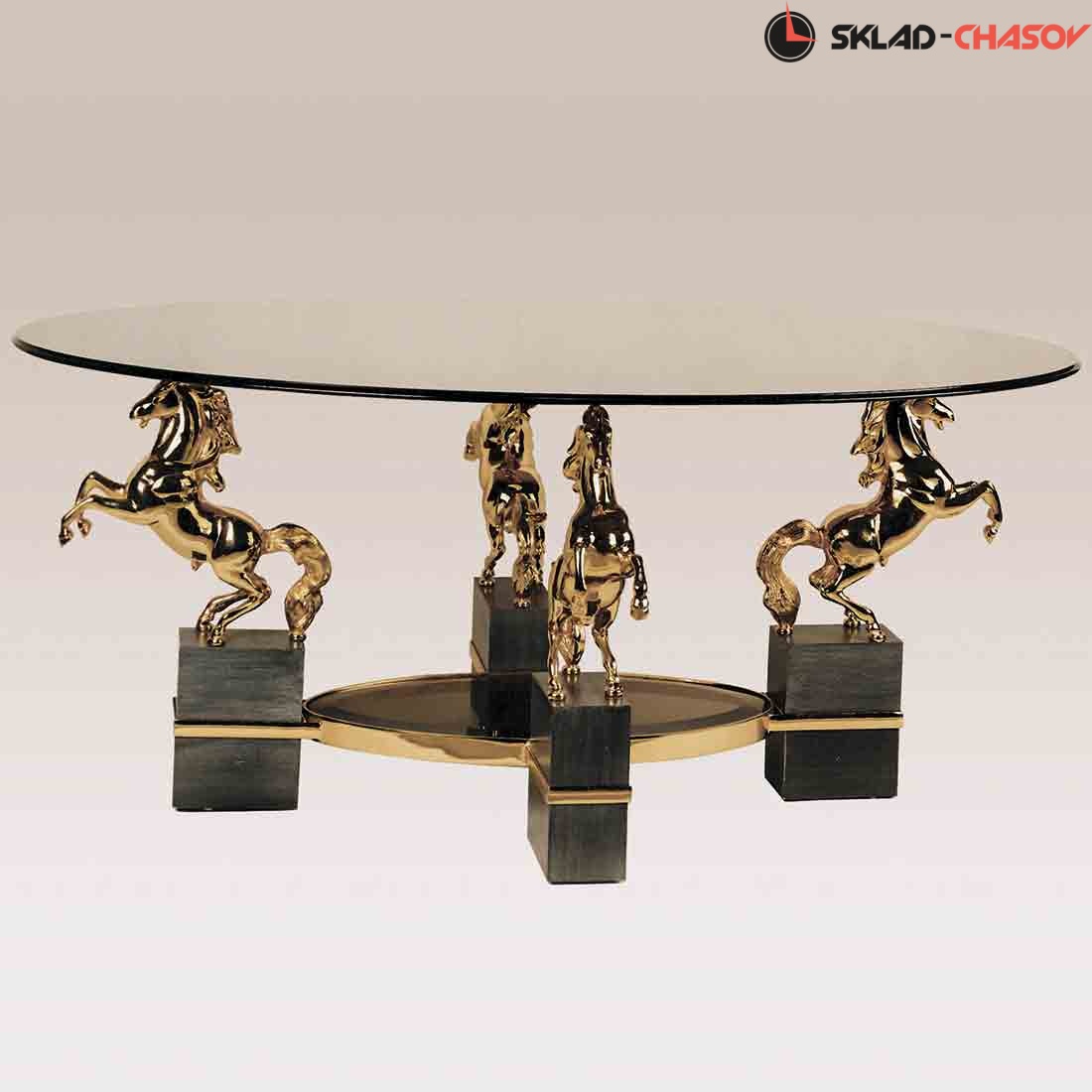 Стол Кони подойдет для украшения квартир, коттеджей, а также хорошо будет смотреться в личных кабинетах. Красиво исполненные лошади одновременно служат основанием стола и его украшением. Они исполнены идентично, что позволило добиться симметрии и хорошей устойчивости. Прозрачное стекло не скрывает привлекательность предмета интерьера.