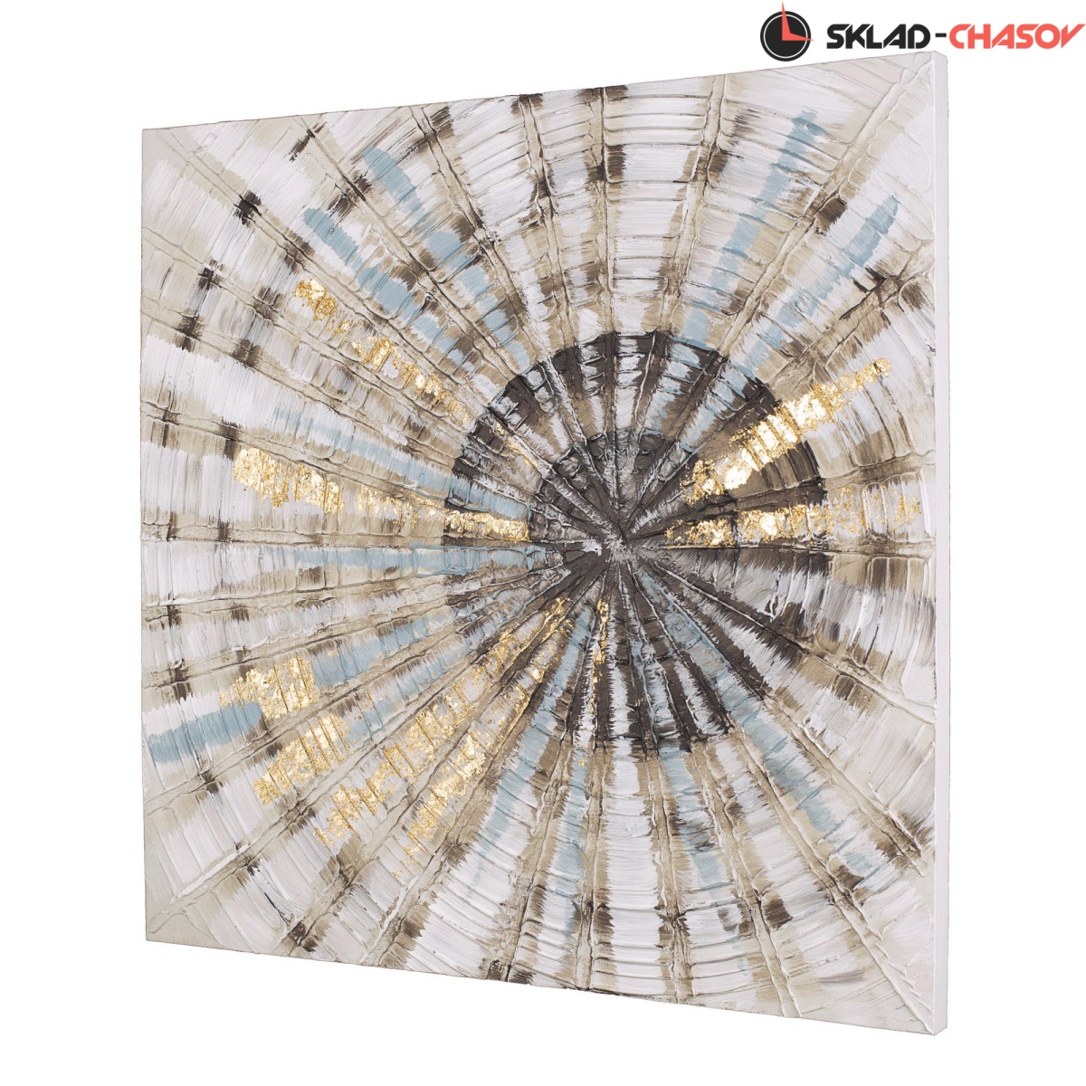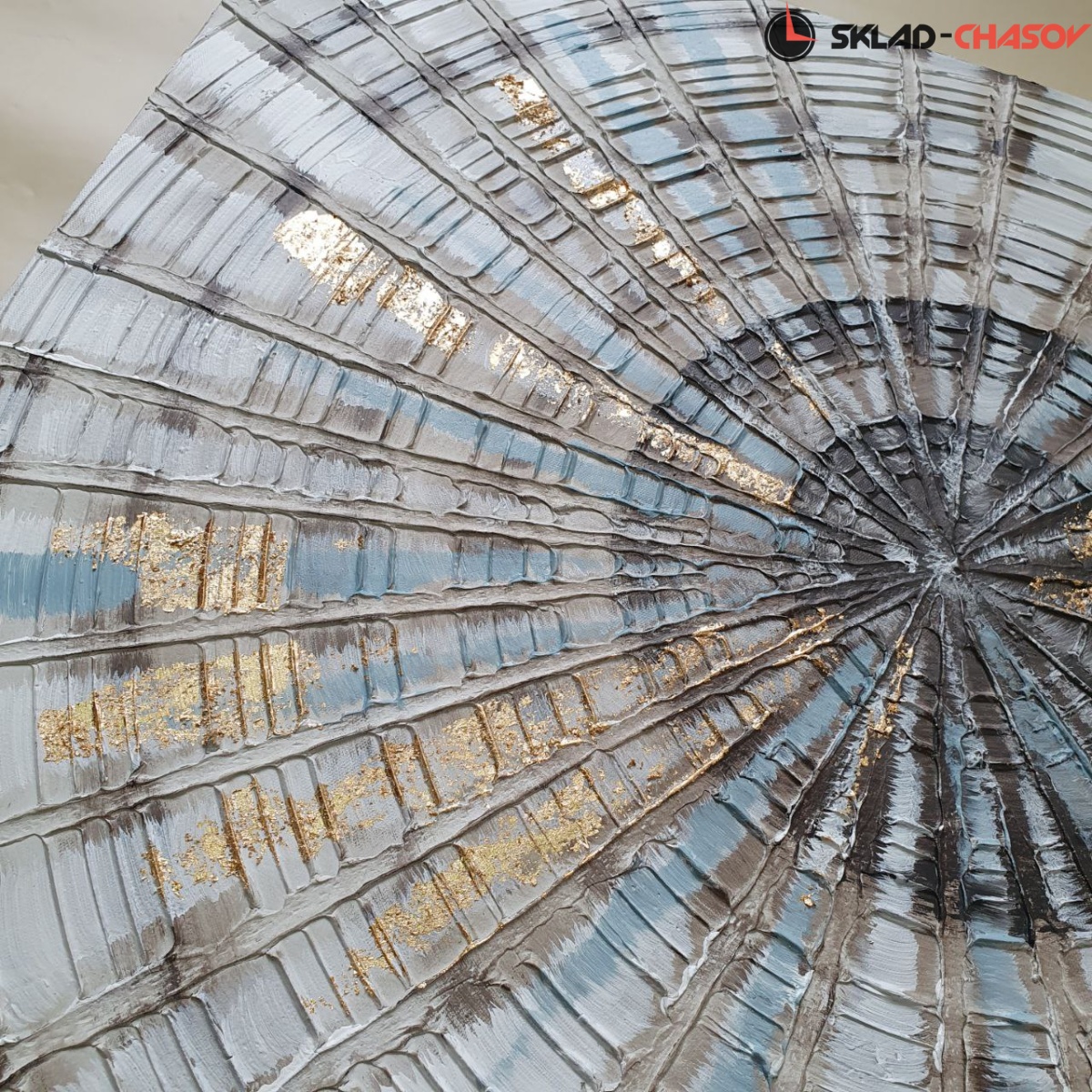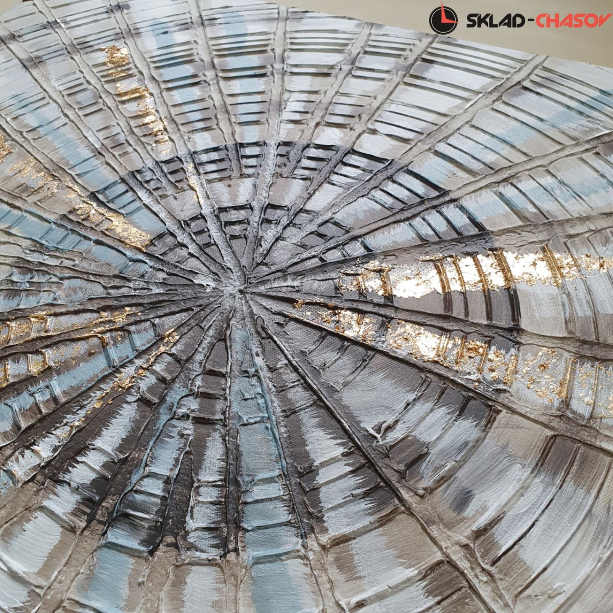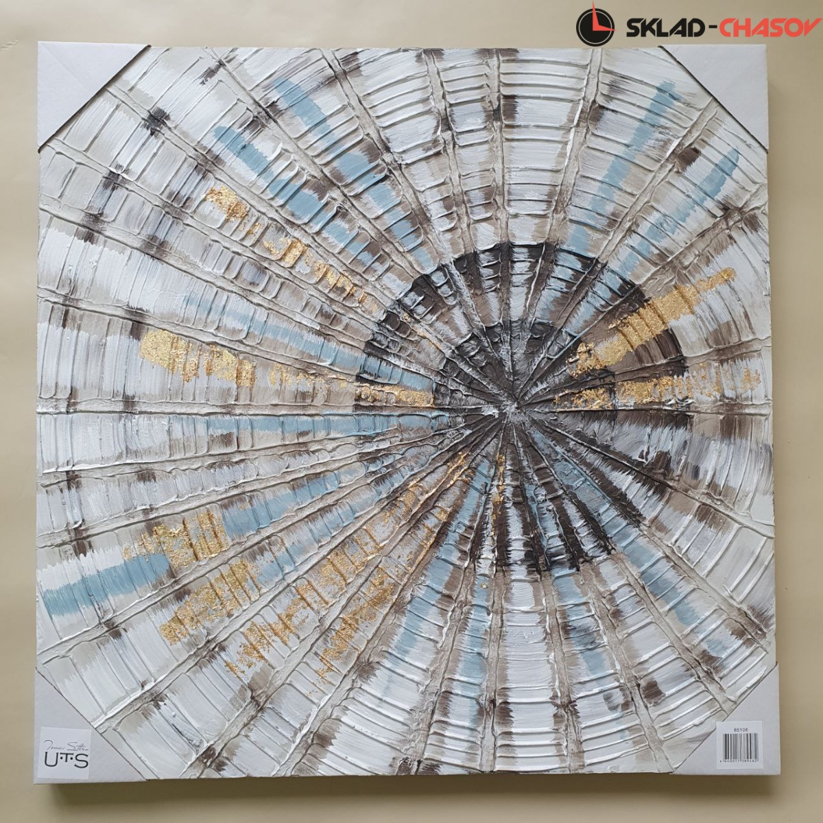 Картина выполнена путем нанесения на холст декоративной шпатлевки и золотистой фольги.