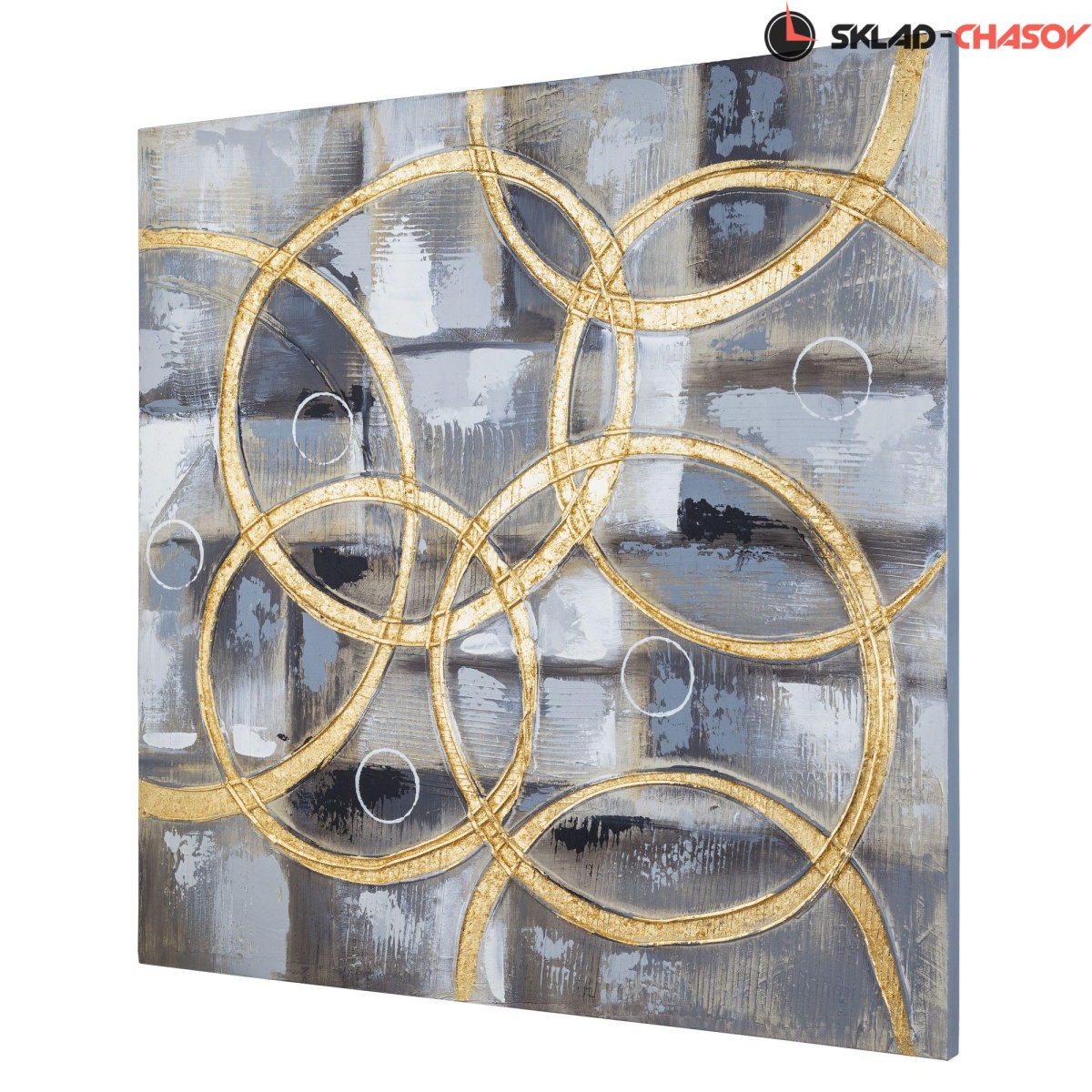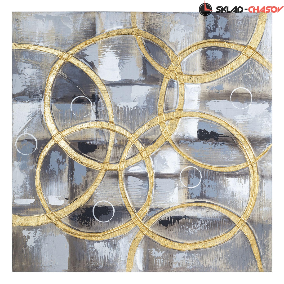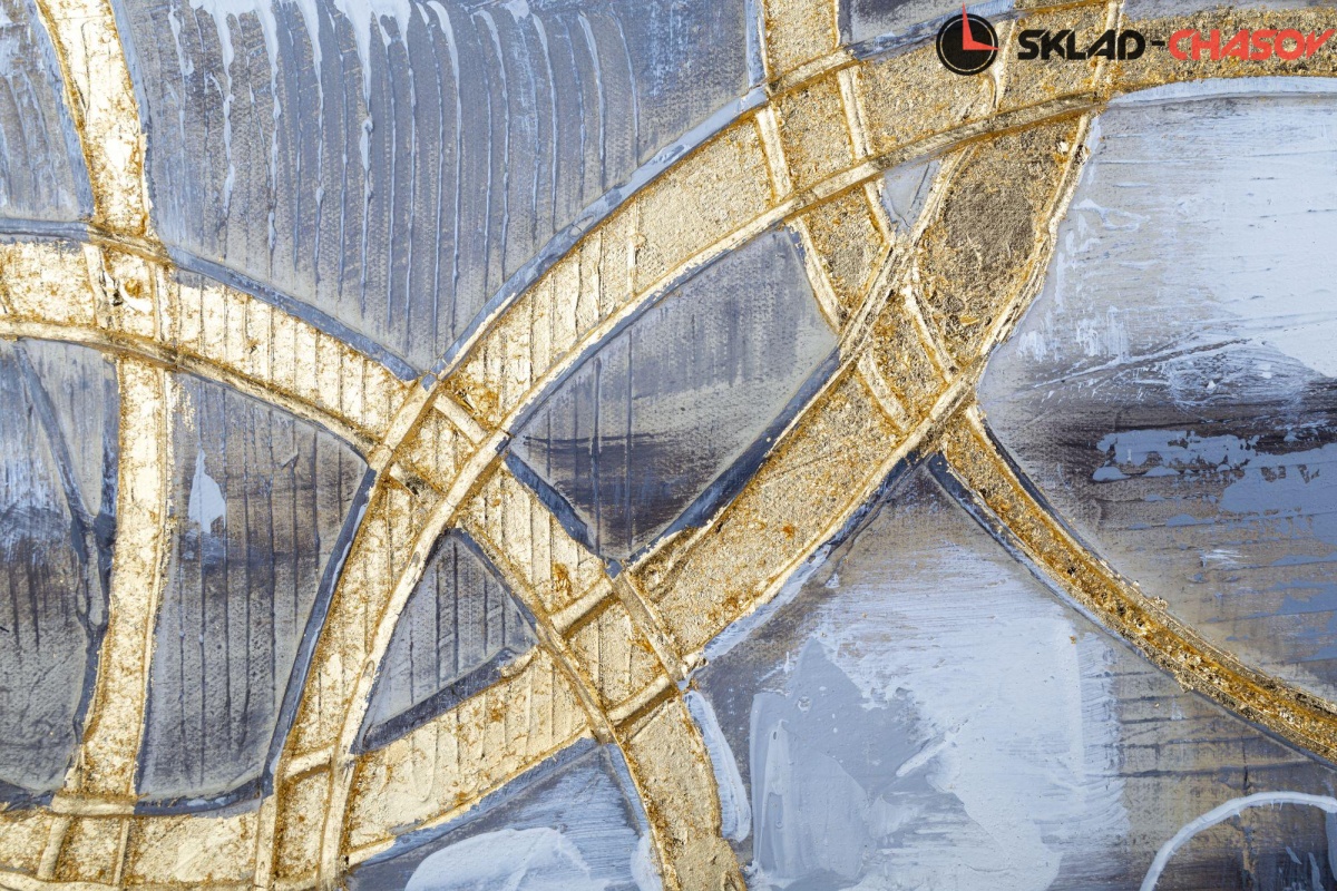 Картина выполнена путем нанесения на холст декоративной шпатлевки и золотистой фольги.
