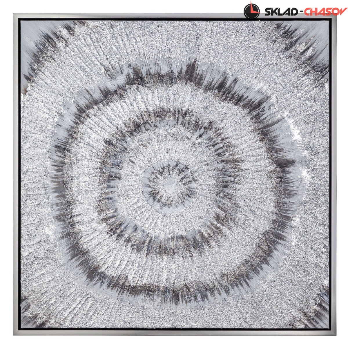 Подрамник выполнен из массива дерева, объемная пластиковая рама серебряного цвета.