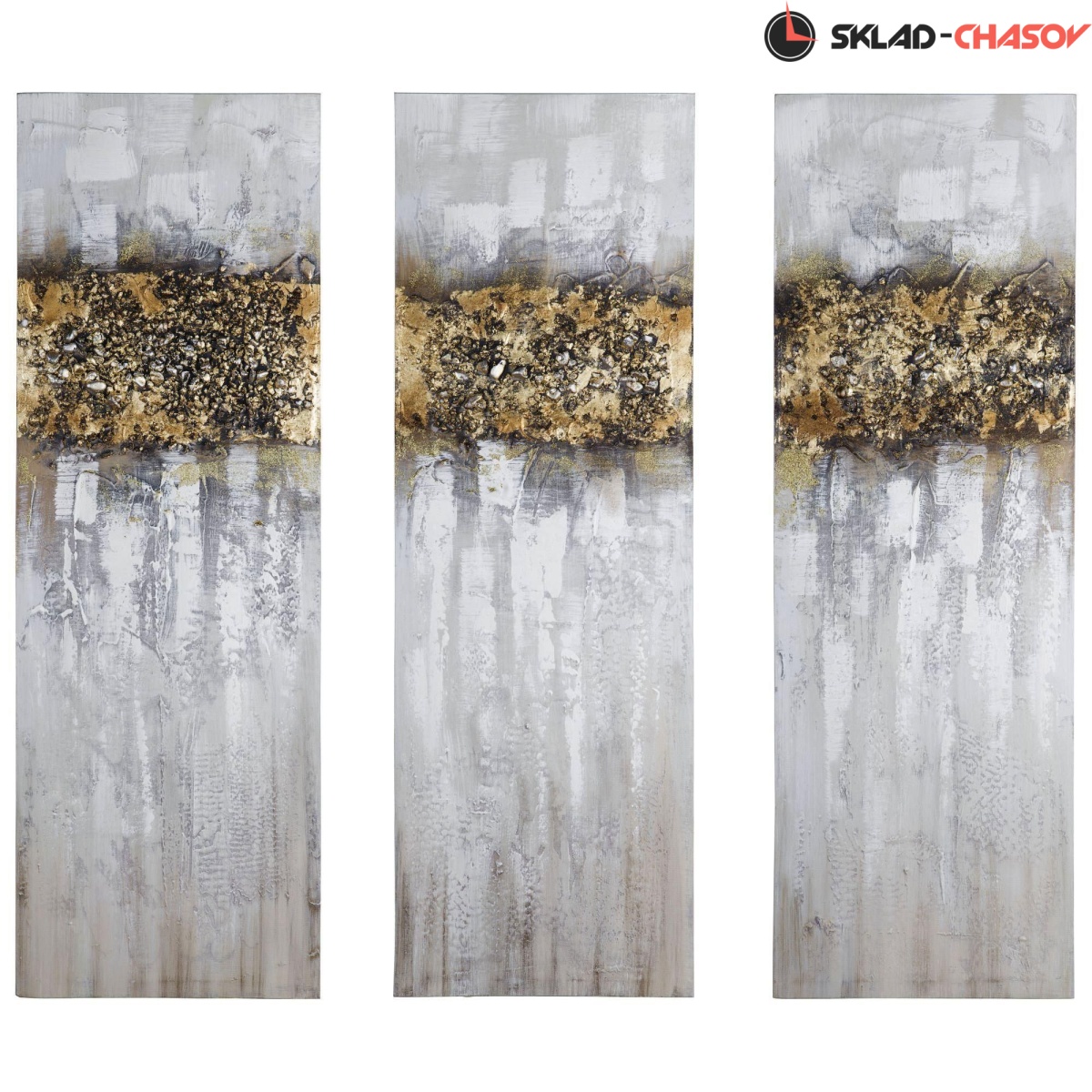 Триптих из 3-х фактурных картин в нежных пастельных тонах. Картины выполнены путем нанесения на холст декоративной шпатлевки, натуральных камней и блесток золотого цвета. Размеры 30 x 90 x 3 см