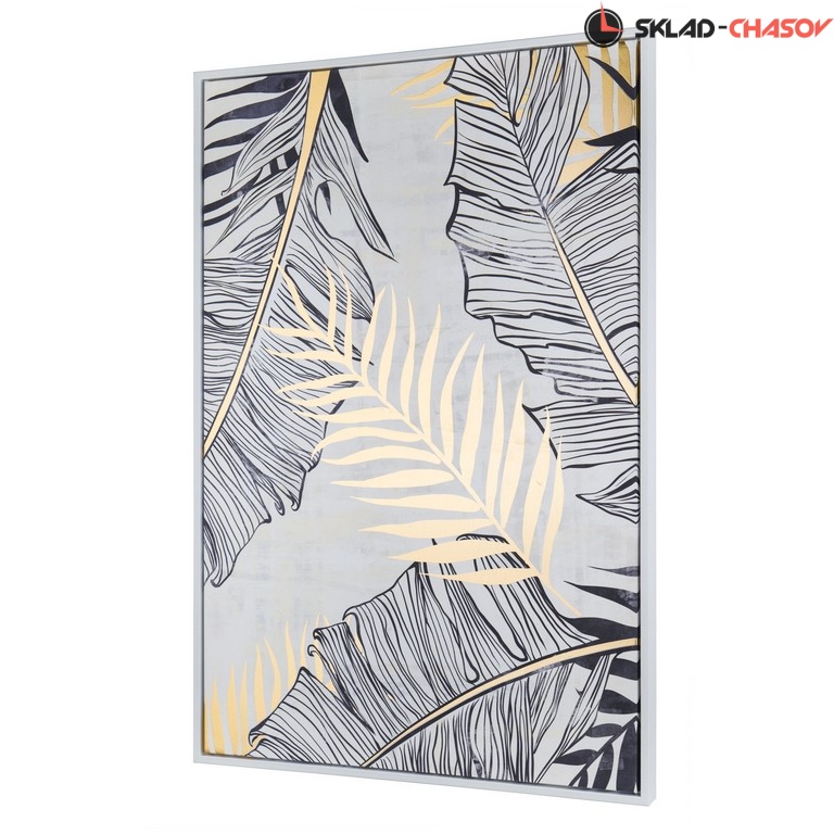 Интерьерное панно. Качественный принт на матовом холсте, декорирование золотой фольгой, подрамник из массива дерева, объемная рама белого цвета. Размеры 90 x 60 x 4 см