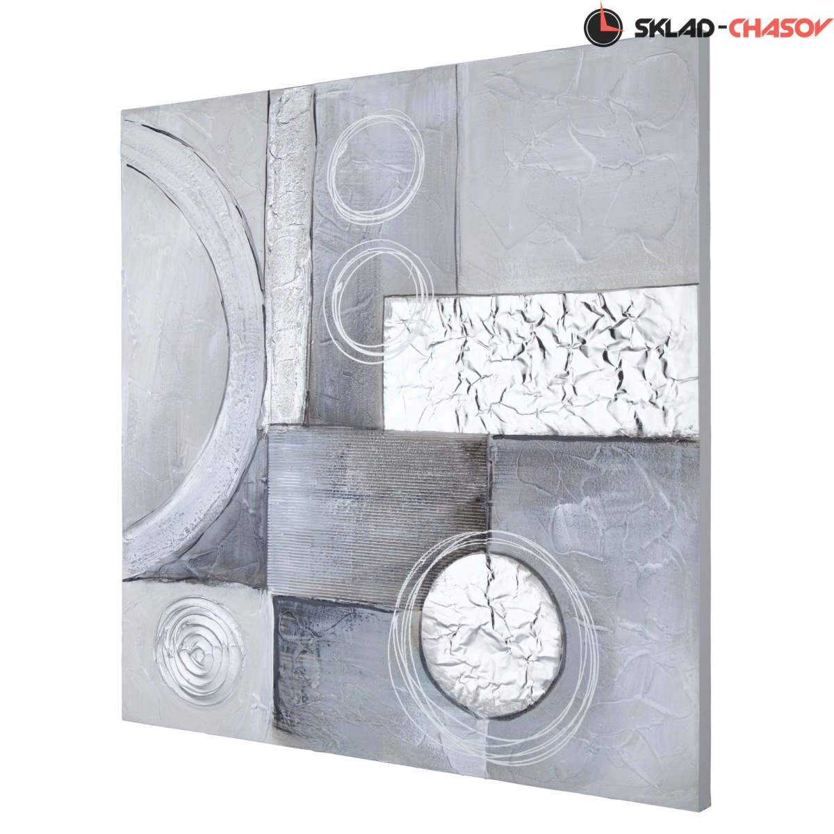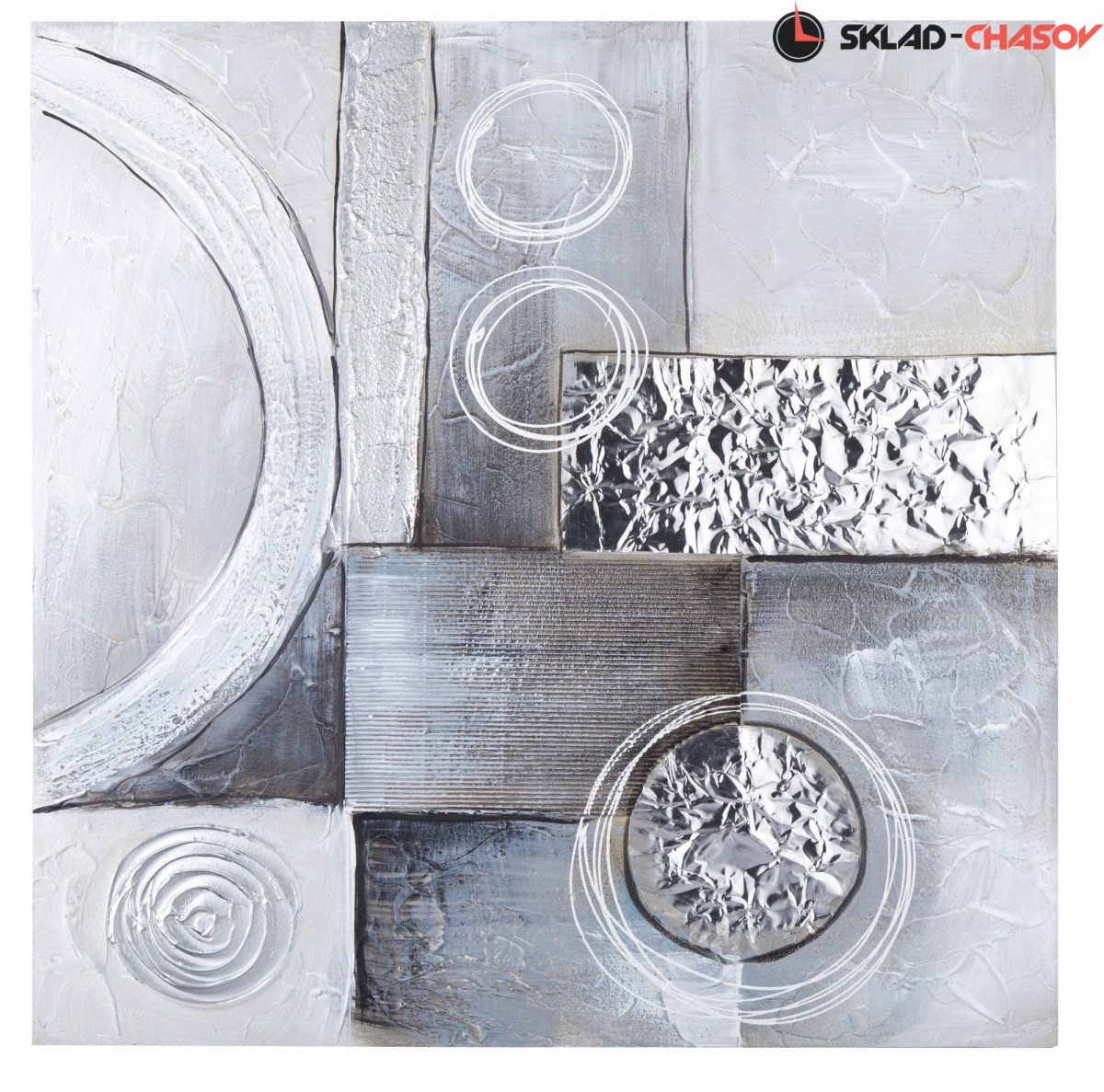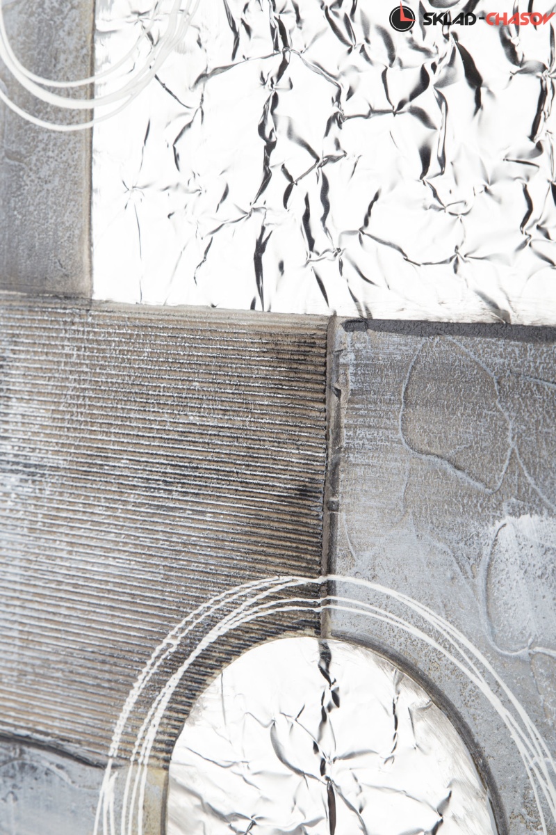 Фактурная картина в абстрактном направлении. Картина выполнена путем нанесения на холст декоративной шпатлевки, гофрокартона, фольги и глиттера. Подрамник выполнен из массива дерева. Размеры 80 x 80 x 3 см