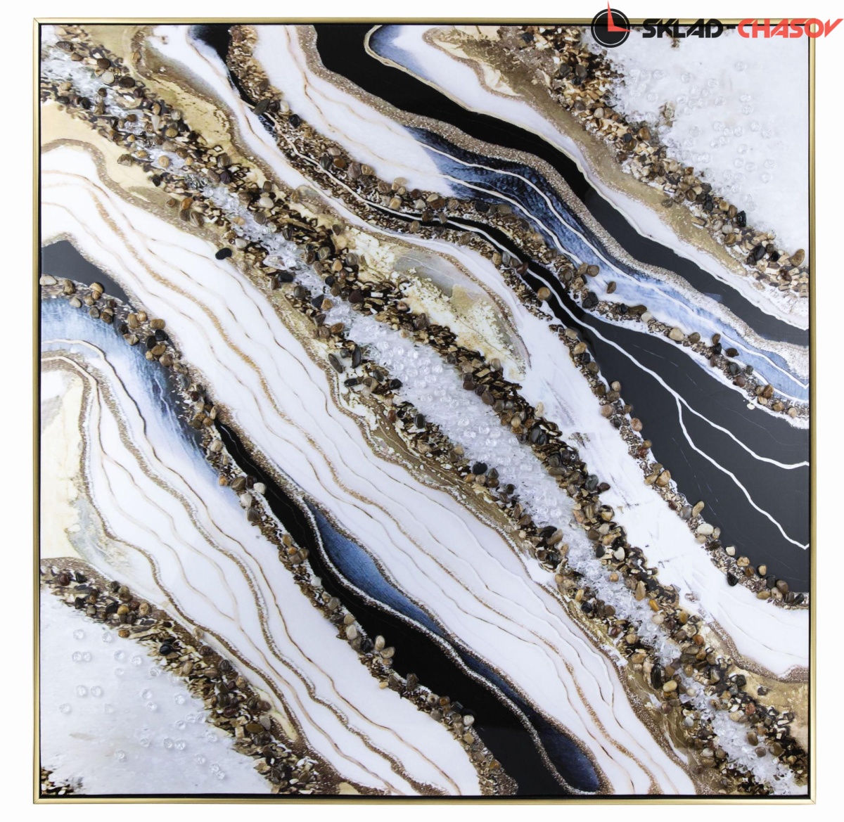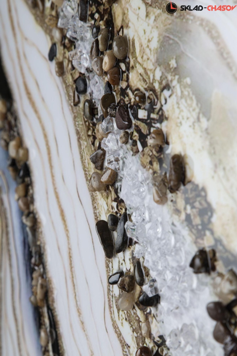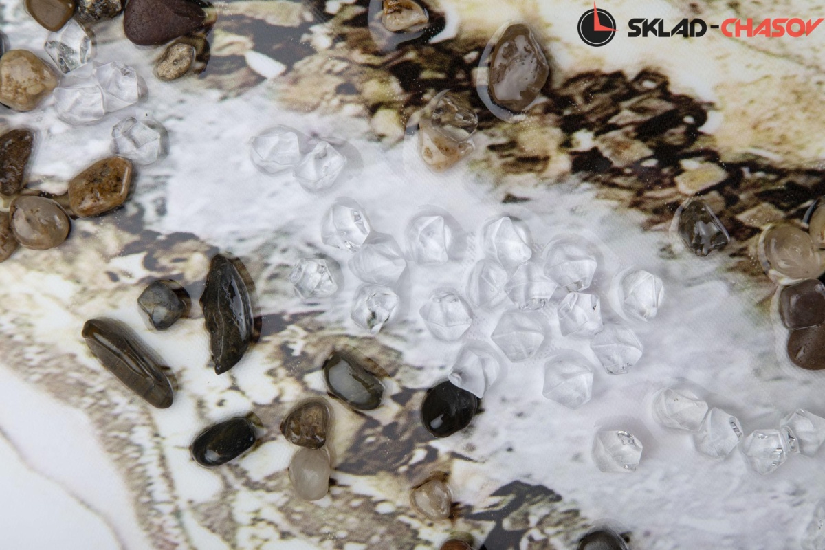 Большая фактурная картина с абстрактным сюжетом в пластиковой раме. Основной рисунок напечатан на холсте и покрыт прозрачным глянцевым лаком. Рисунок картины удачно подчеркивают натуральные камни, рассыпанные по хосту. Подрамник выполнен из массива дерева. Размеры 102 x 102 x 4 см