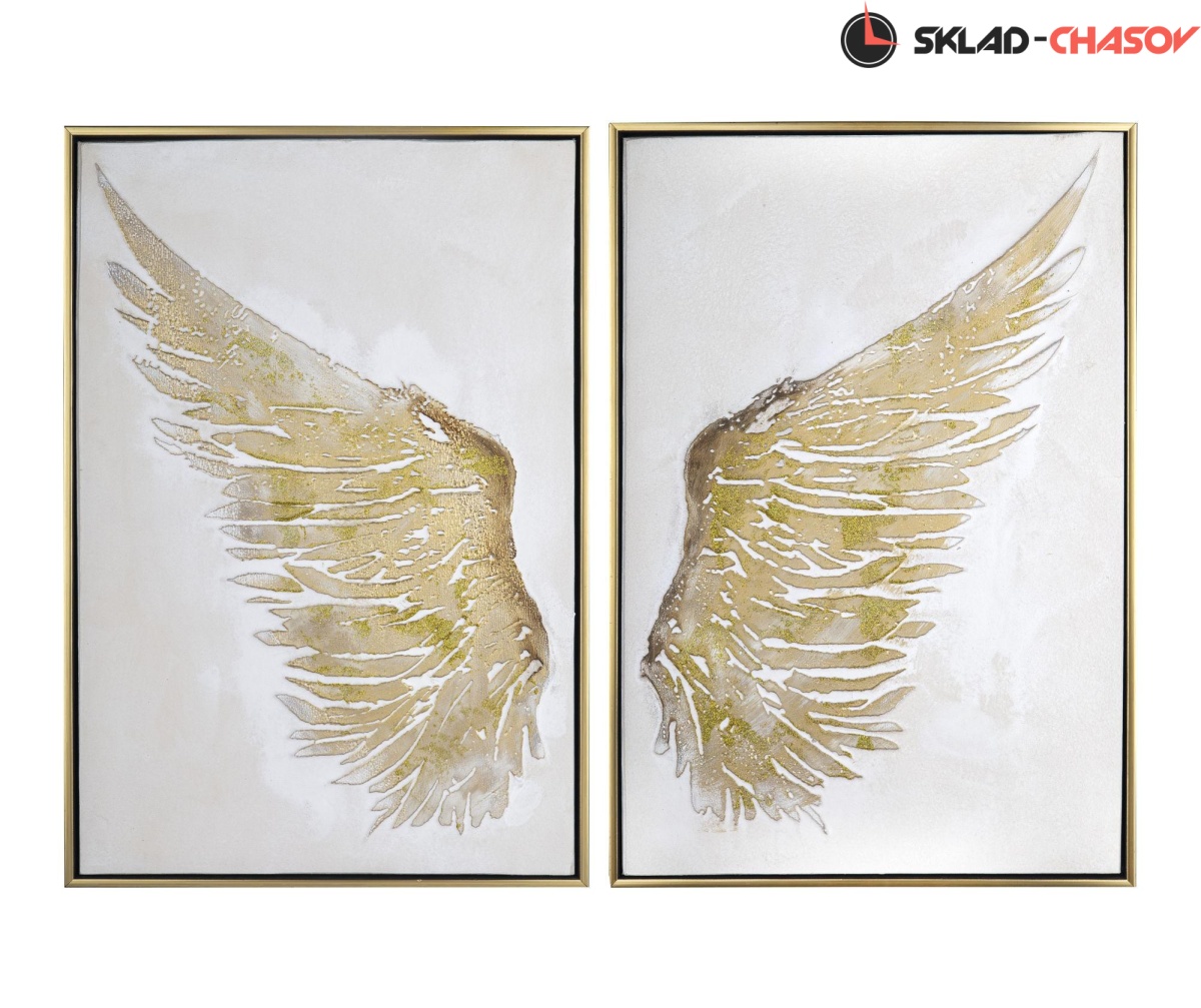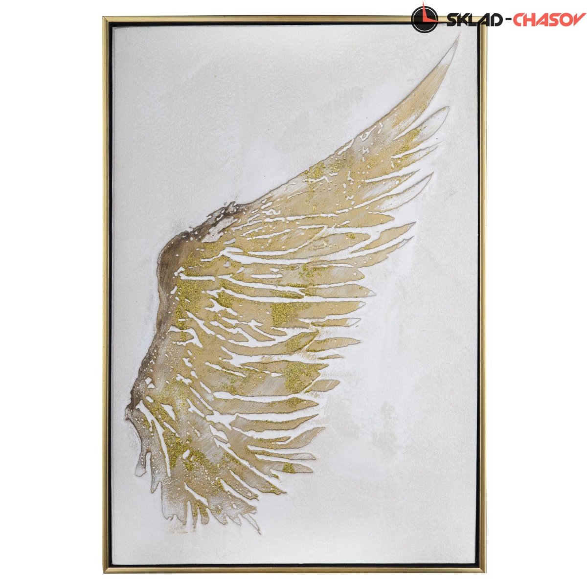 Фактурная картина с изображением крыла. Картина выполнена из объемного полистирола, а золотые акценты выполнены при помощи глиттера. Подрамник выполнен из массива дерева, рама из пластика. Картину прекрасно дополняет модель 85073. Размеры 62 x 42 x 4 см