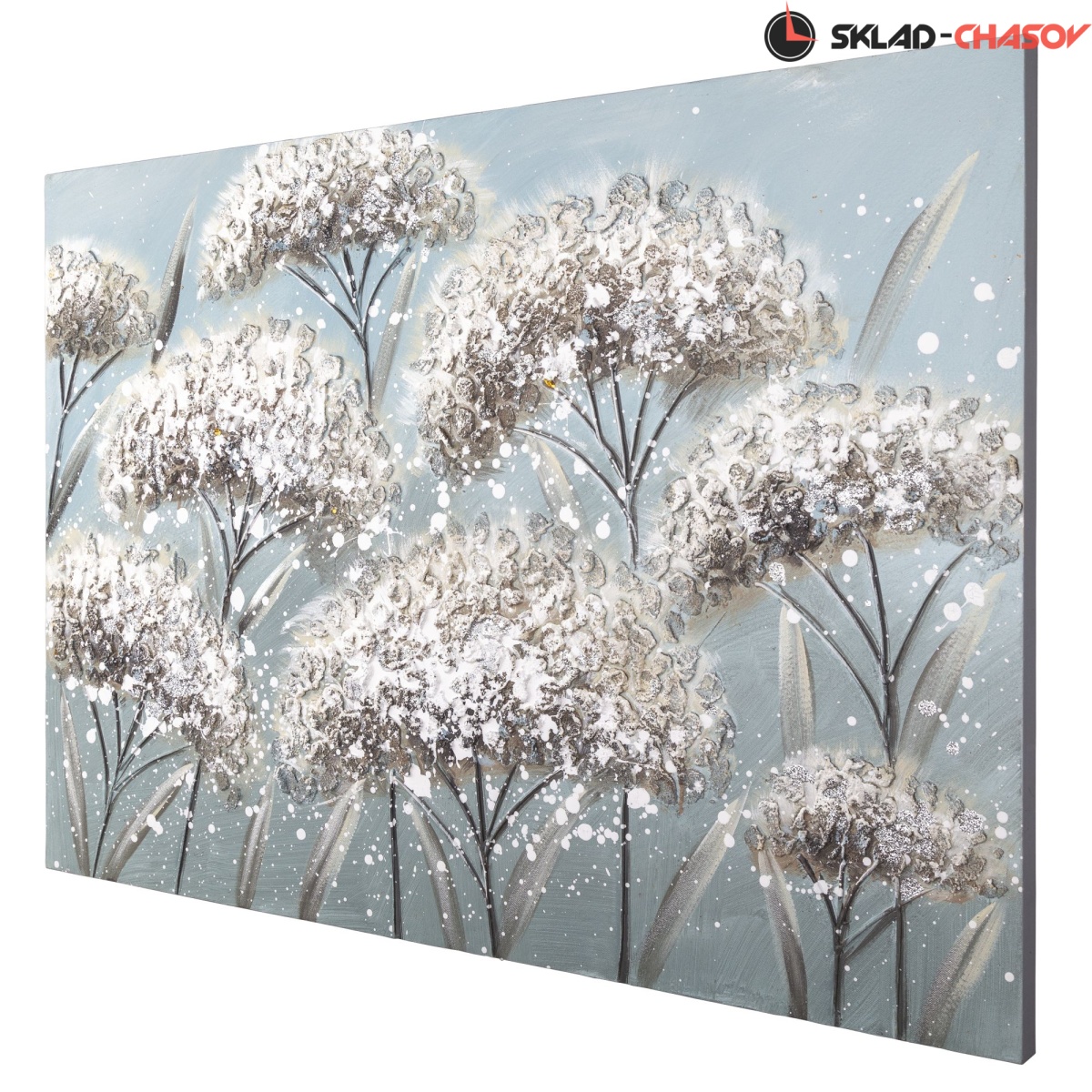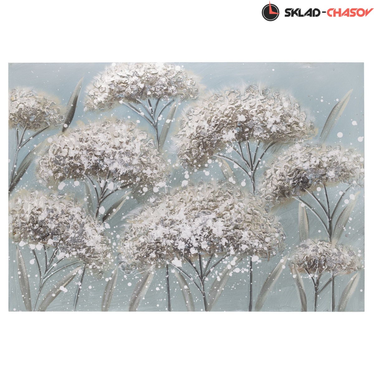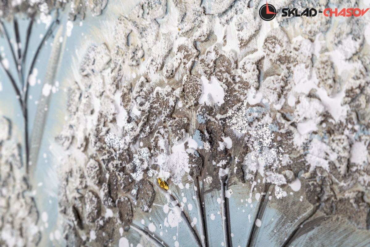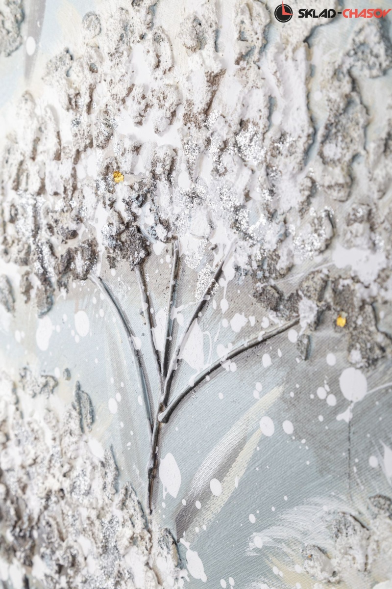 Картина выполнена путем нанесения на холст декоративной шпатлевки, рогожки, веток и глиттера.