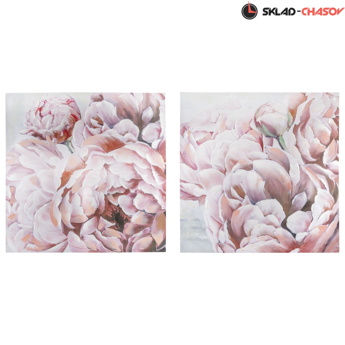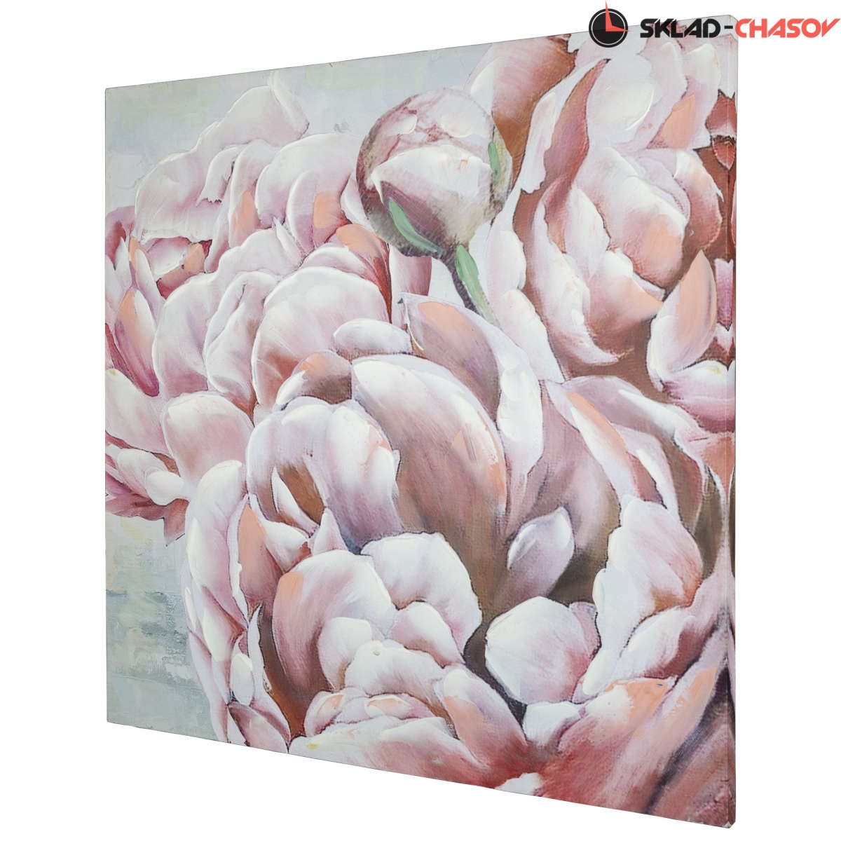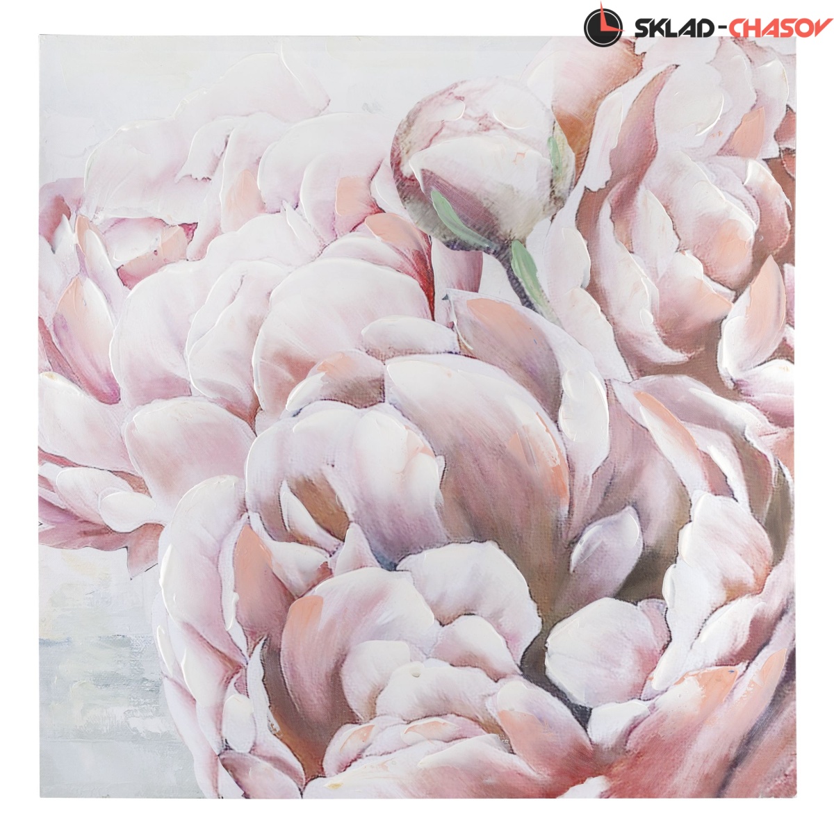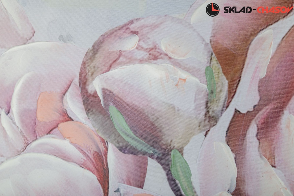 Картина выполнена путем печати на холсте. Для придания большего объема и фактуры, отдельные лепестки и бутоны проработаны жирными мазками декоративной шпатлевки.