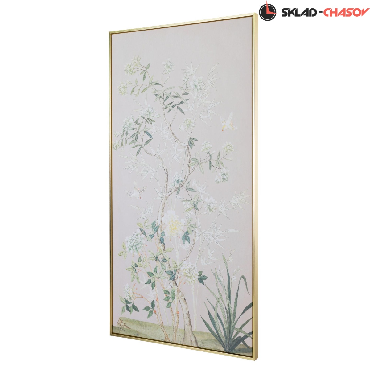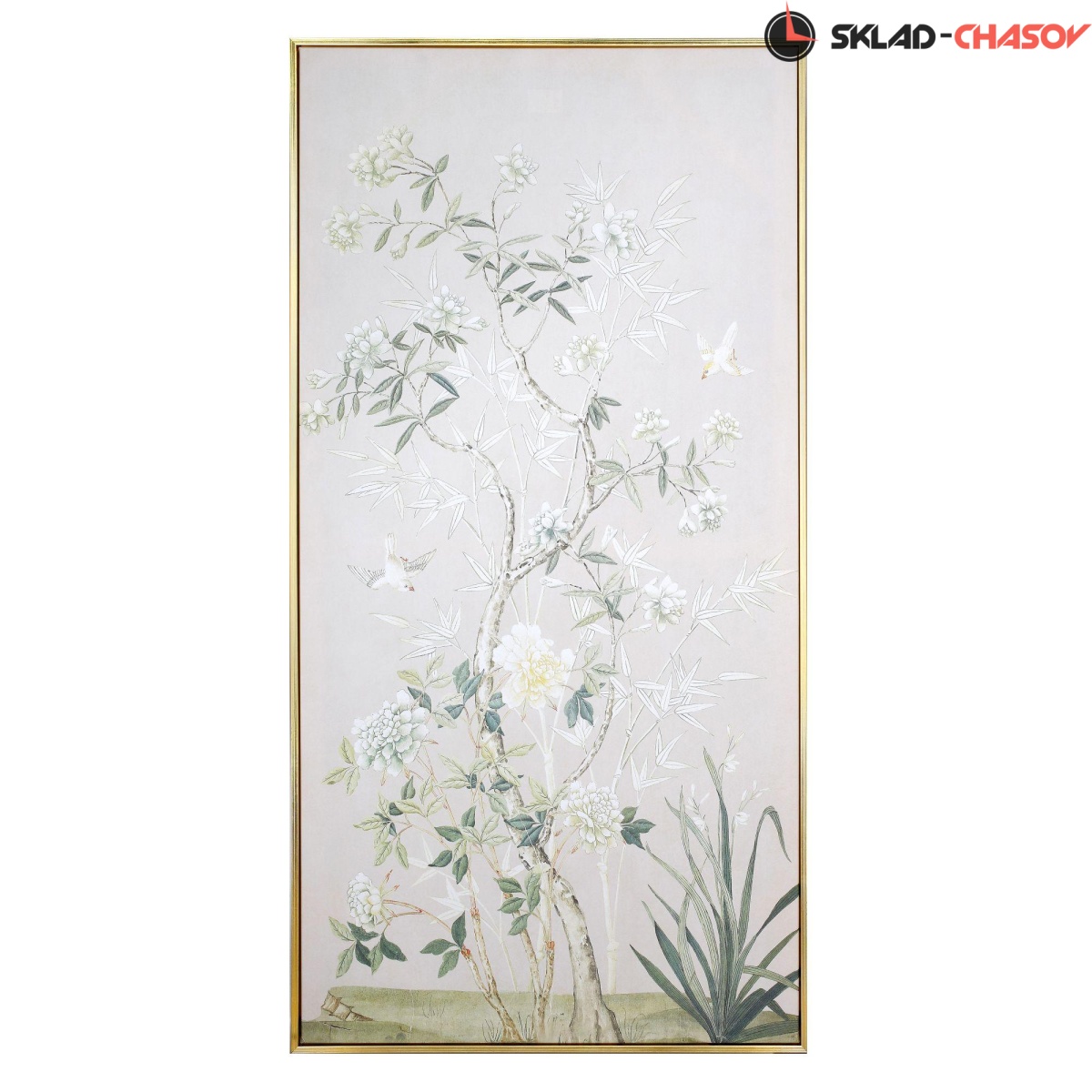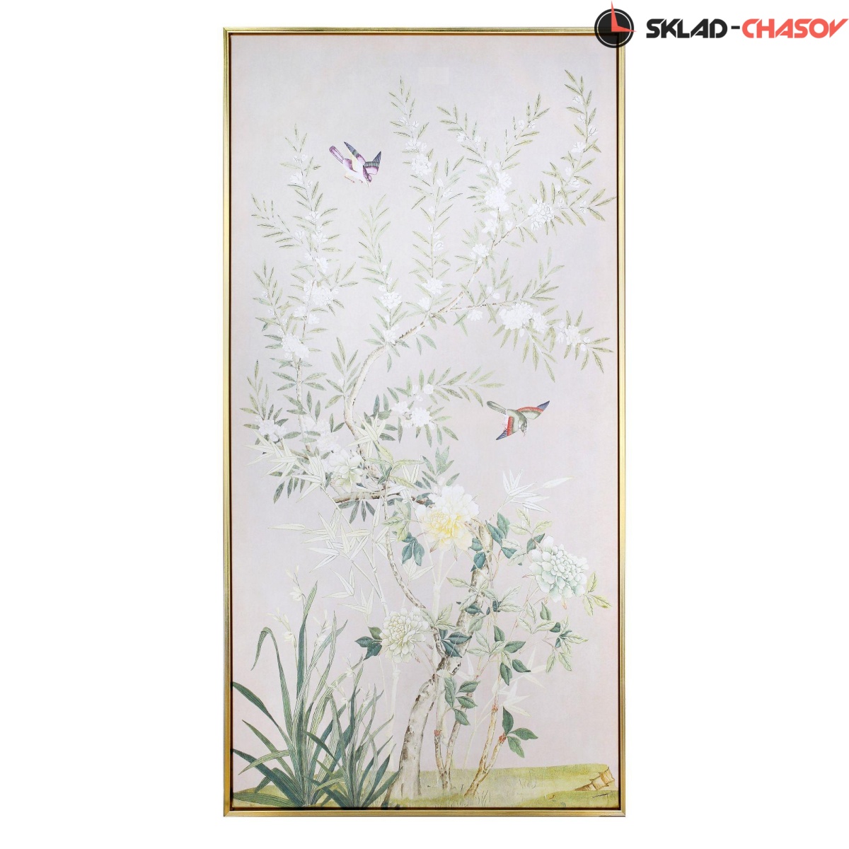 Подрамник выполнен из массива дерева, объемная пластиковая рама золотого цвета.