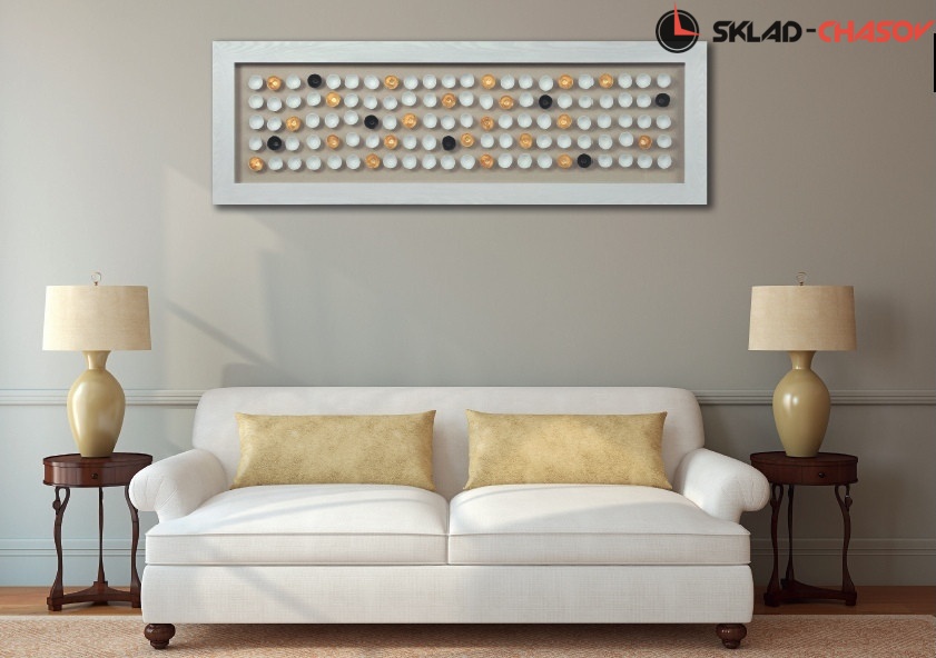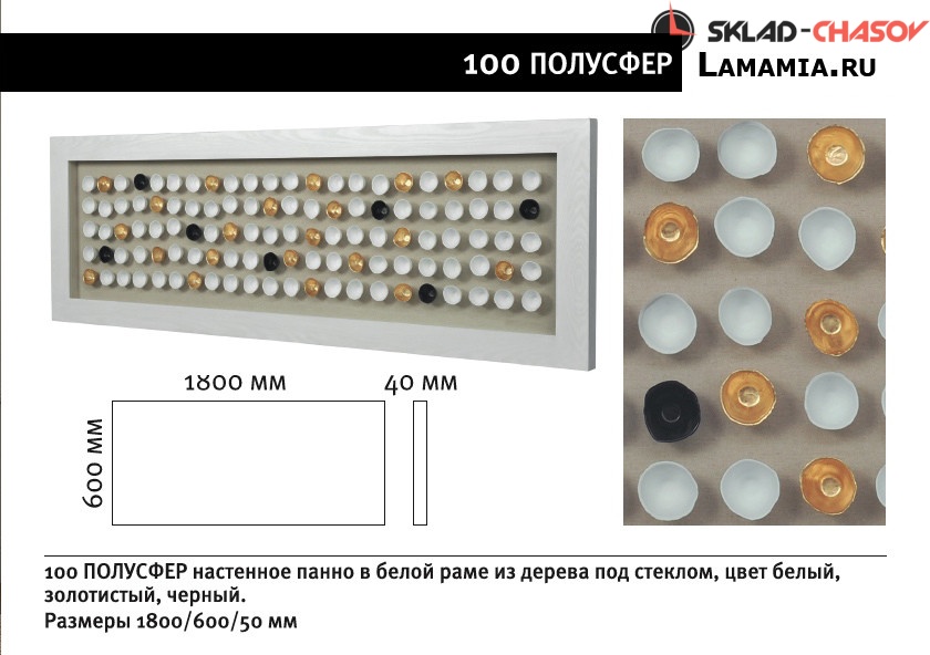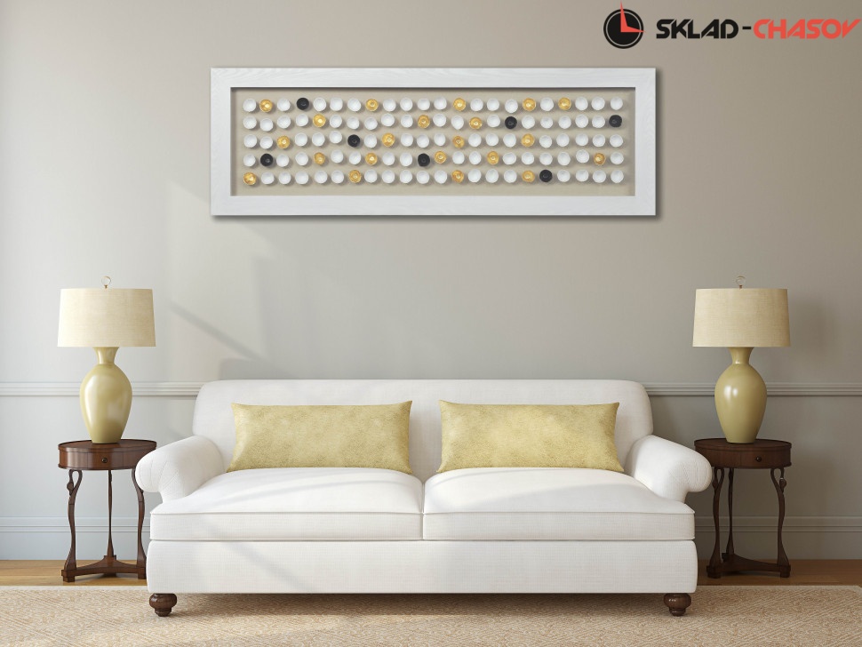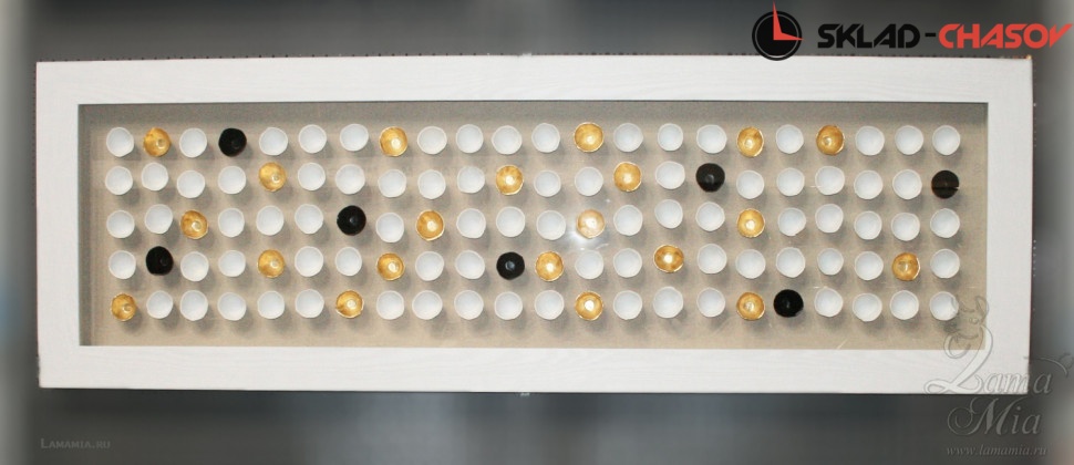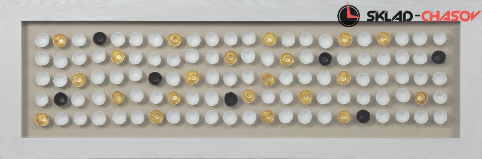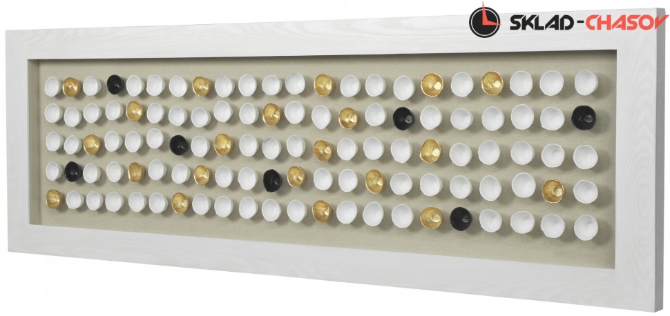 Дизайнерское панно "100 полусфер". Панно в деревянной белой раме, застеклённой с фронтальной стороны, в центр которого помещены белые, золотые и чёрные полусферы. Размеры: высота 60 см, ширина 180 см, глубина 4 см. Артикул 22361.