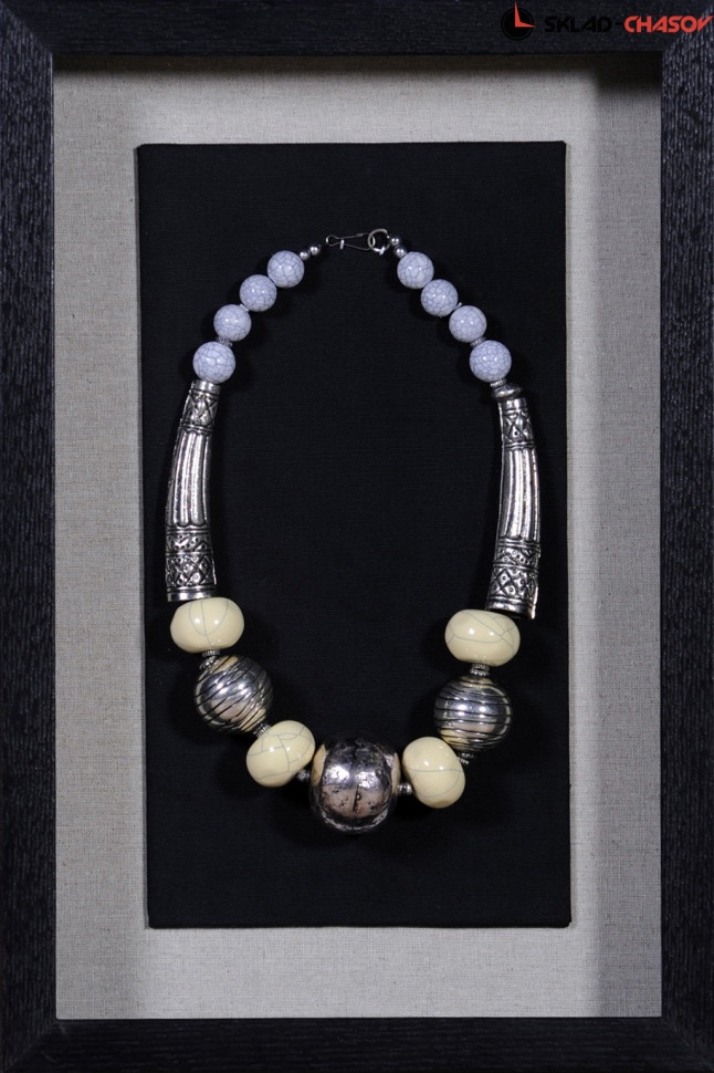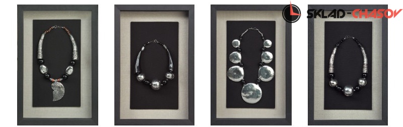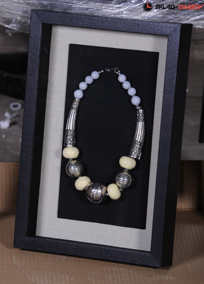 Дизайнерское панно "Ожерелье 3". Панно для подвеса на стену содержит на чёрном фоне металлическое ожерелье. Панно заключено в деревянную раму, с внешней стороны покрытую стеклом. Размеры: высота 45 см, ширина 30 см, глубина 4.5 см. Артикулы: 15154C.