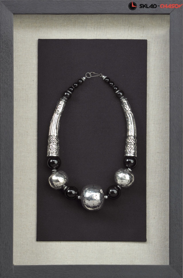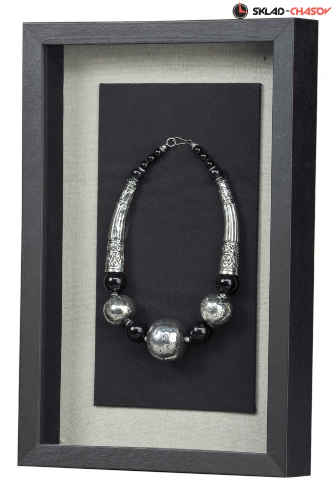 Дизайнерское панно "Ожерелье 4". Панно для подвеса на стену содержит на чёрном фоне металлические ожерелья. Панно заключено в деревянную раму, с внешней стороны покрытую стеклом. Размеры: высота 45 см, ширина 30 см, глубина 4.5 см. Артикул: 15154D.