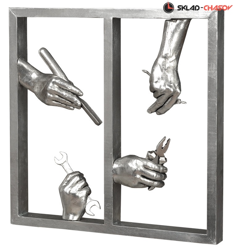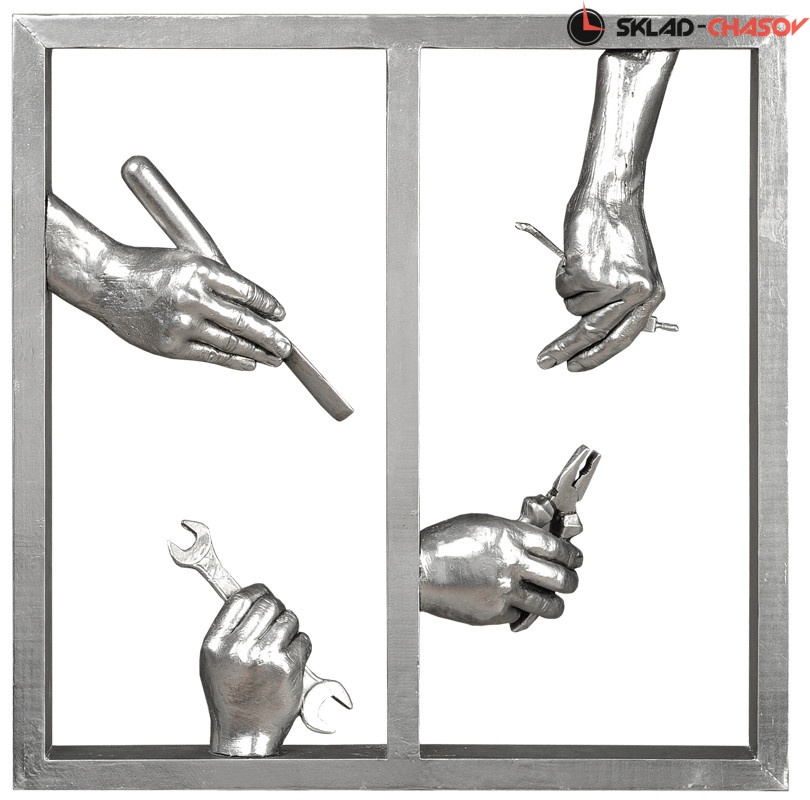 Серебристое панно рельефно изображает руки человека, вооружённого инструментами.