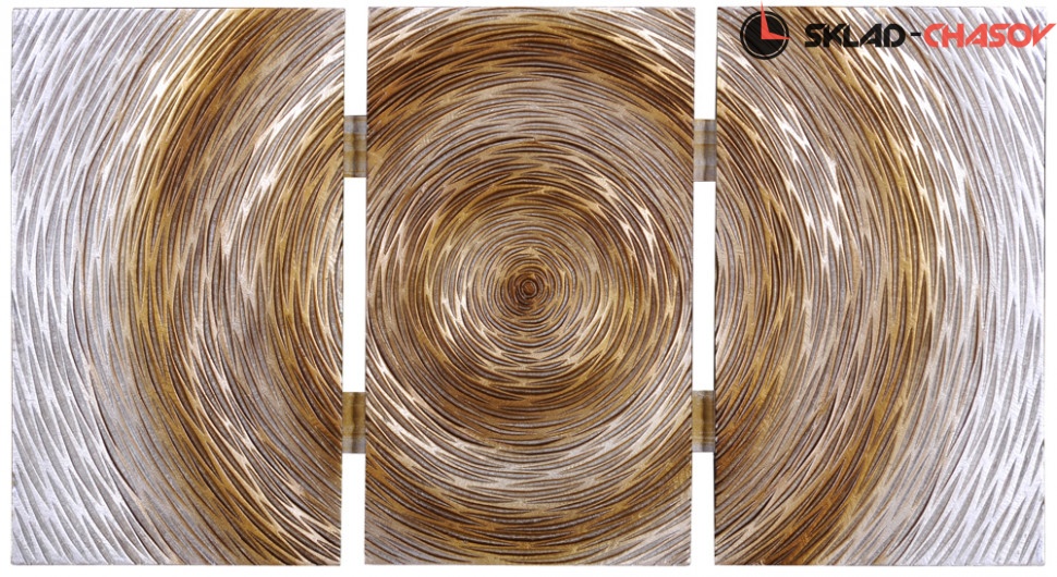 Дизайнерское панно "Салют 1". Серебристое панно с расходящимися золотистыми кругами на деревянной основе. Высота 40 см, ширина 70 см, глубина 4.5 см. Артикул 39451A.
