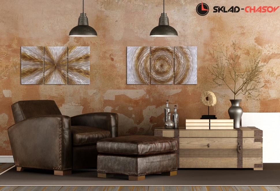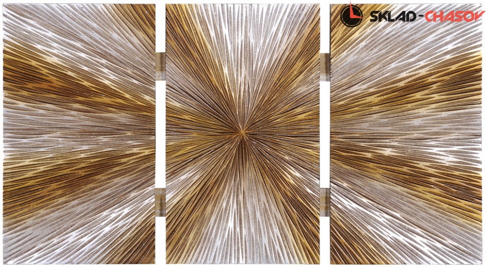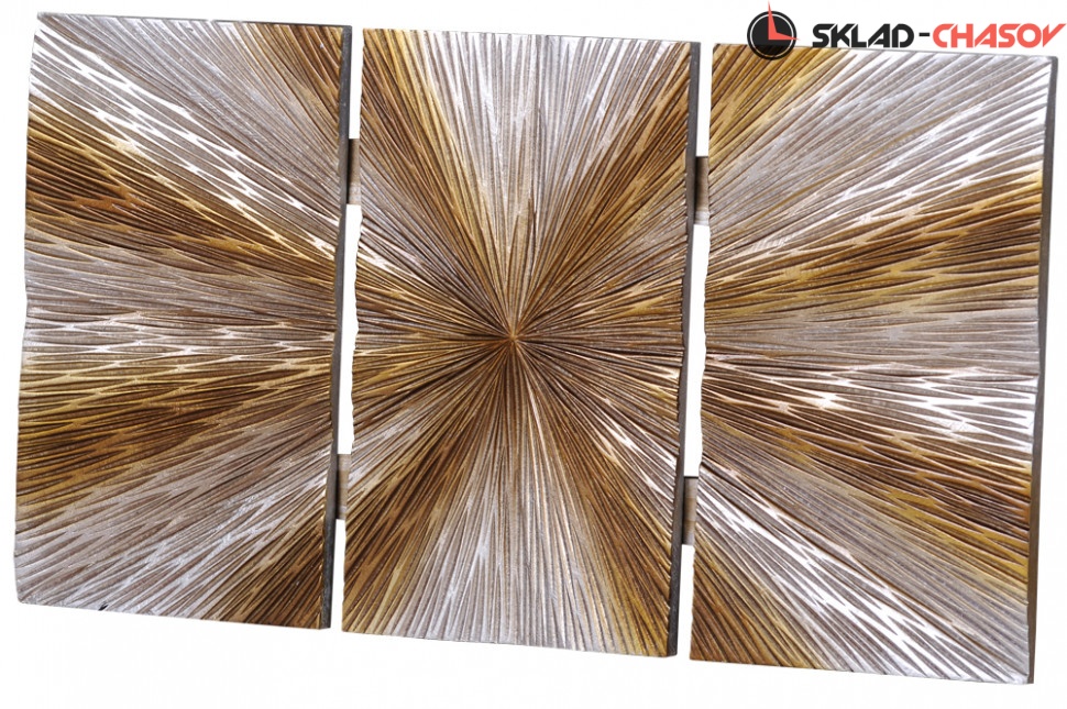 Дизайнерское панно "Салют 2". Серебристое панно с расходящимися золотистыми кругами на деревянной основе. Высота 40 см, ширина 70 см, глубина 4.5 см. Артикул 39451B.