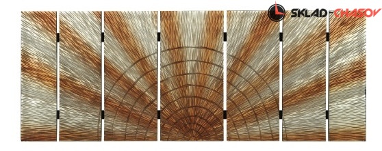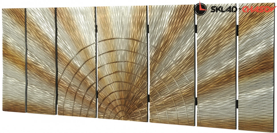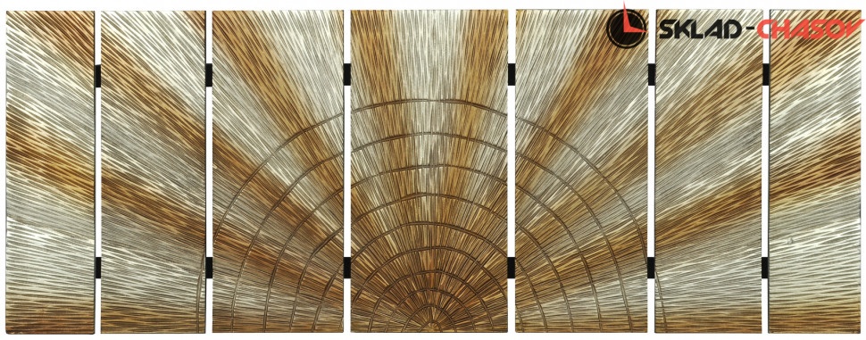 Дизайнерское панно "Сияние". Серебристое панно с расходящимися золотистыми лучами на деревянной основе. Размеры: высота 60 см, ширина 160 см, глубина 4 см. Артикул 20140B.