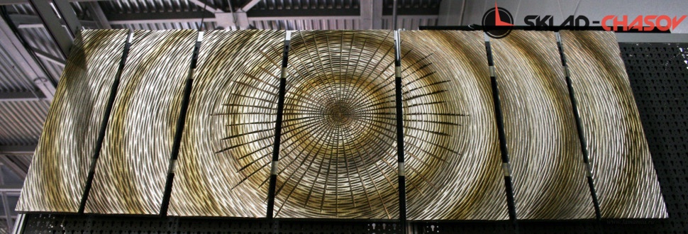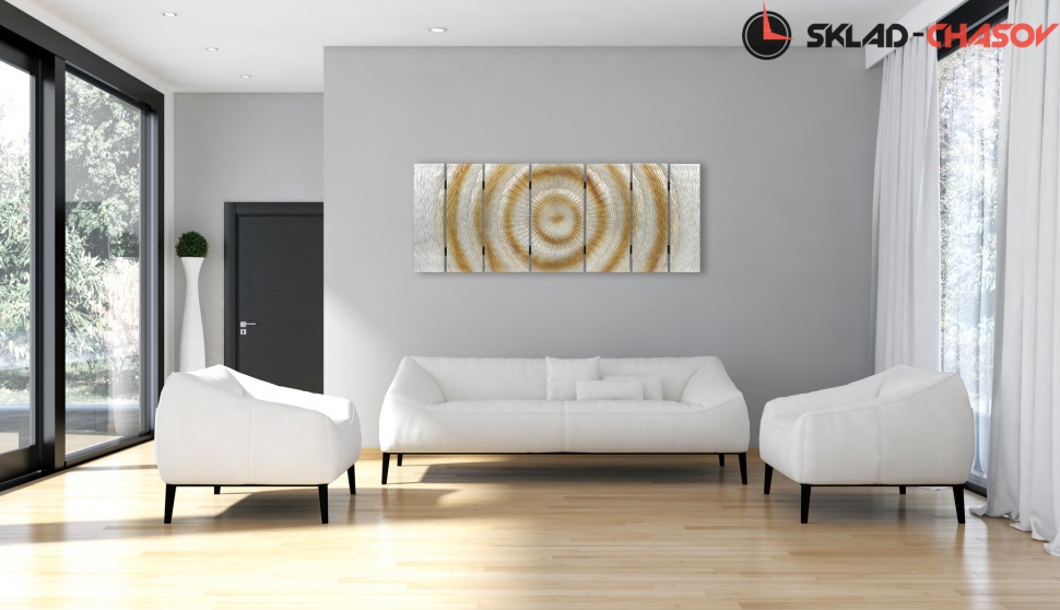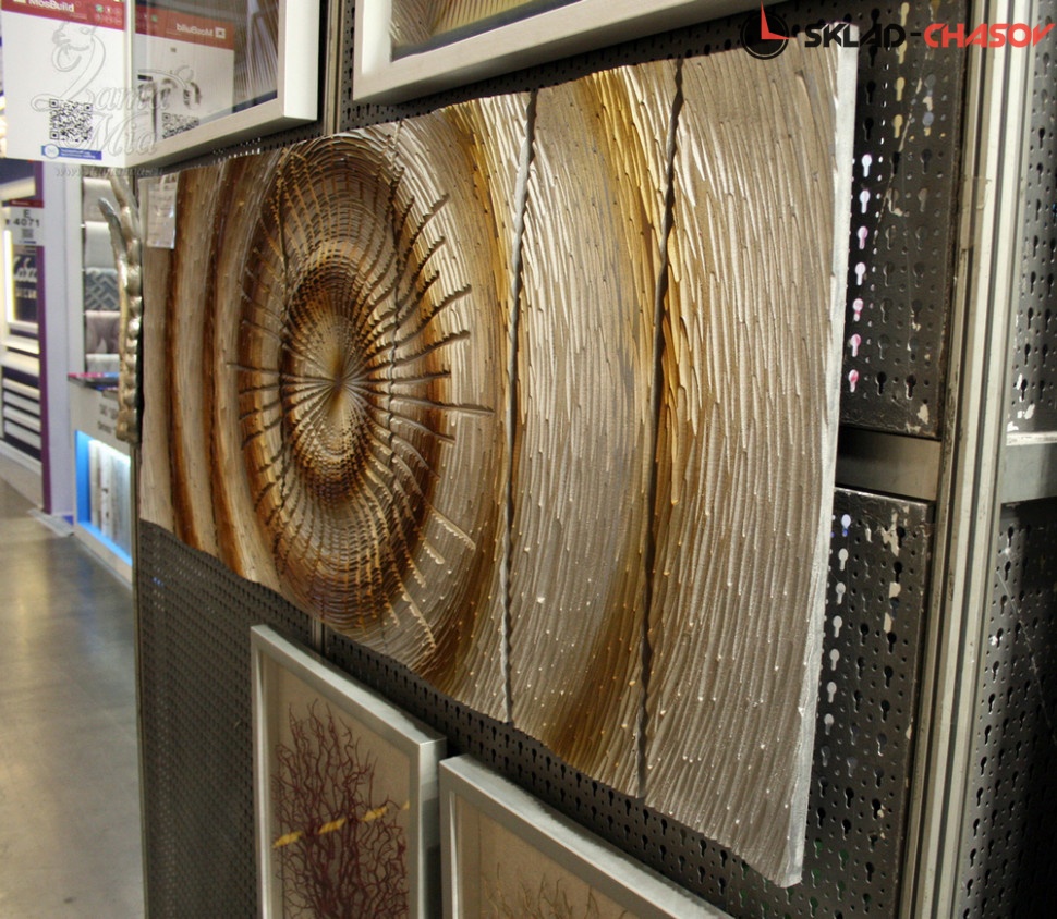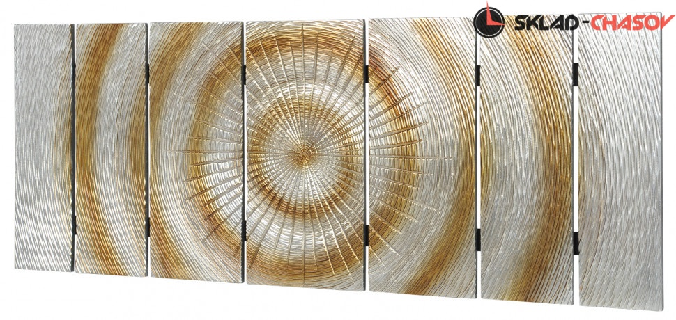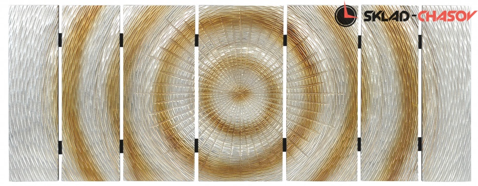 Дизайнерское панно "Солнце". Серебристое панно с расходящимися золотистыми кругами на деревянной основе. Размеры: высота 60 см, ширина 160 см, глубина 4 см. Артикул 20140A.