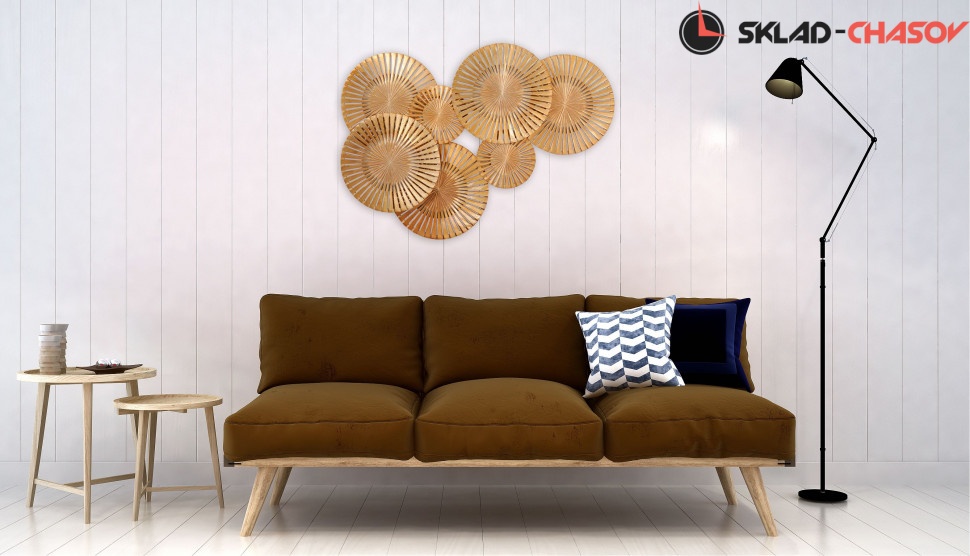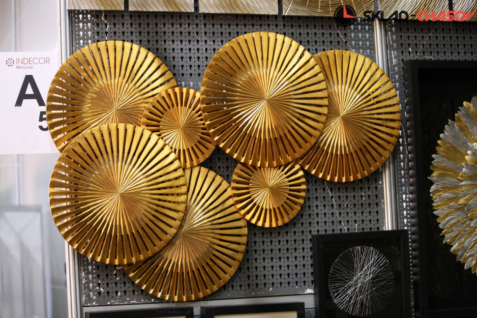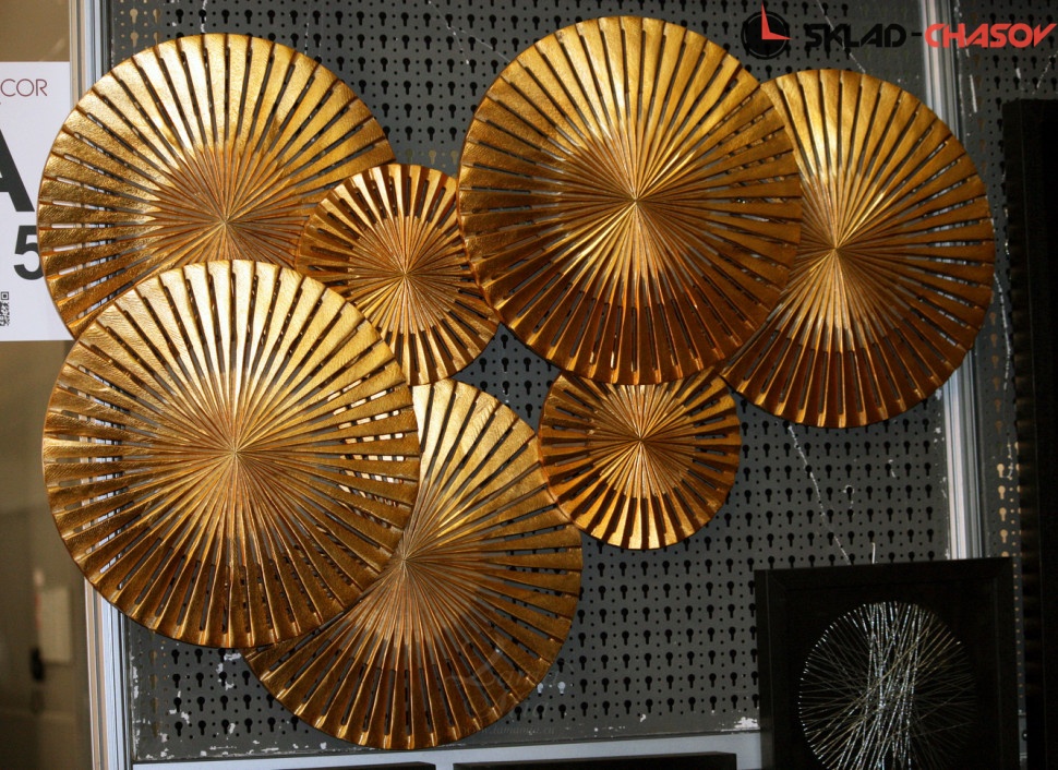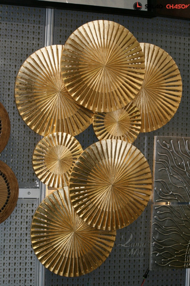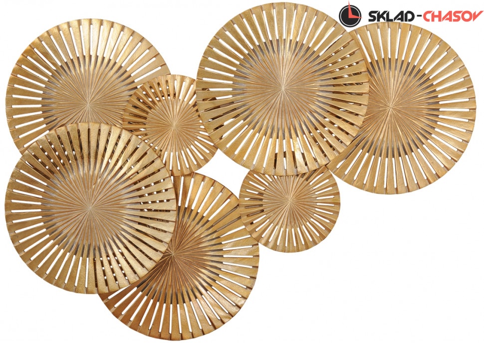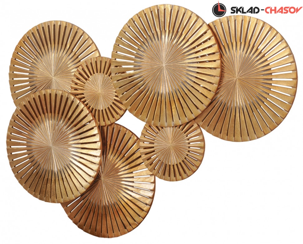 Дизайнерское панно "Зонтики большие". Золотистое панно с семью фигурными сферами. Размеры: высота 80 см, ширина 120 см, глубина 6 см. Артикул 21512F.