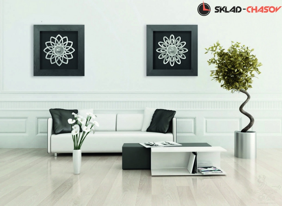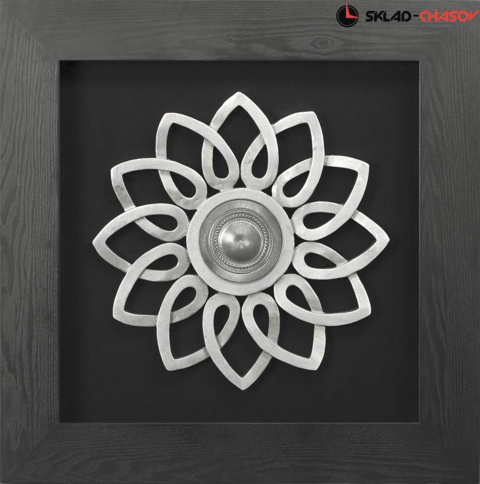 Квадратное панно "Декор большой - 1". Настенное квадратное панно в строгой чёрной деревянной раме. Под стеклом на чёрном фоне расположен металлизированный декоративный элемент с круговой симметрией. Размеры: высота 80 см, ширина 80 см, глубина 5 см. Артикул 20297A.