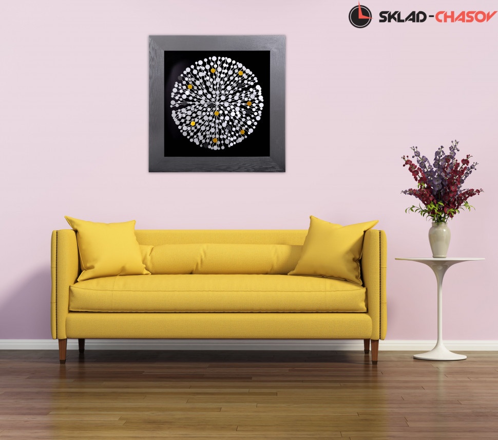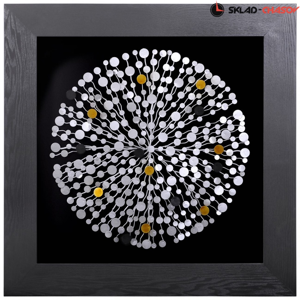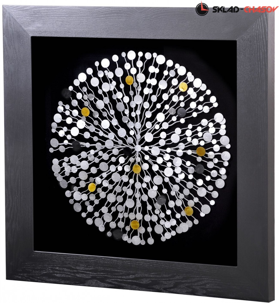 Квадратное панно "Плеяды звёзд (круг)". Настенное квадратное панно в чёрной деревянной раме. Под стеклом на чёрном фоне расположены металлические серебряные и золотые металлические элементы, соединённые изогнутыми металлическими мостиками. Размеры: высота и ширина 90 см, глубина 5 см. Артикул 22634.