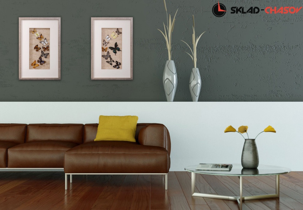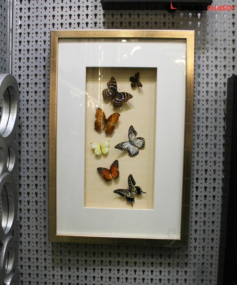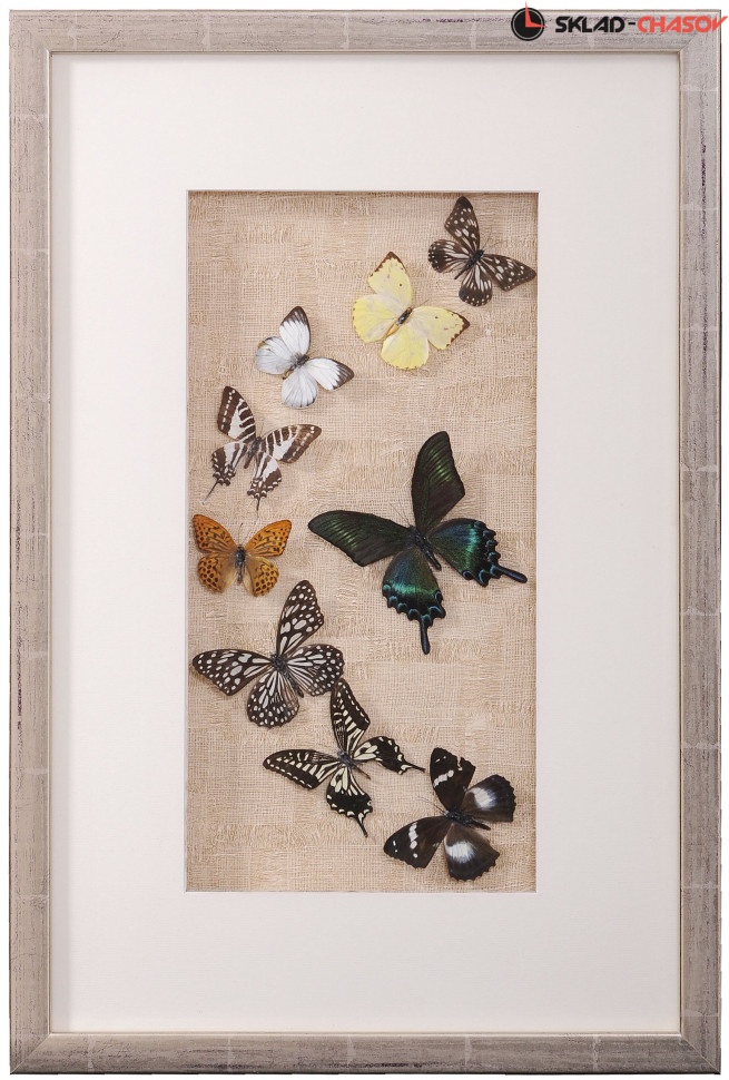 Настенное панно "Бабочки 1" в бежевой деревянной раме под стеклом. Красивое панно с настоящими разноцветными бабочками. Рама светло-бежевая с выраженной древесной текстурой. Подложка из бежевого холста. Размер: 40 х 60 х 3.5 см. Артикул 11843A.