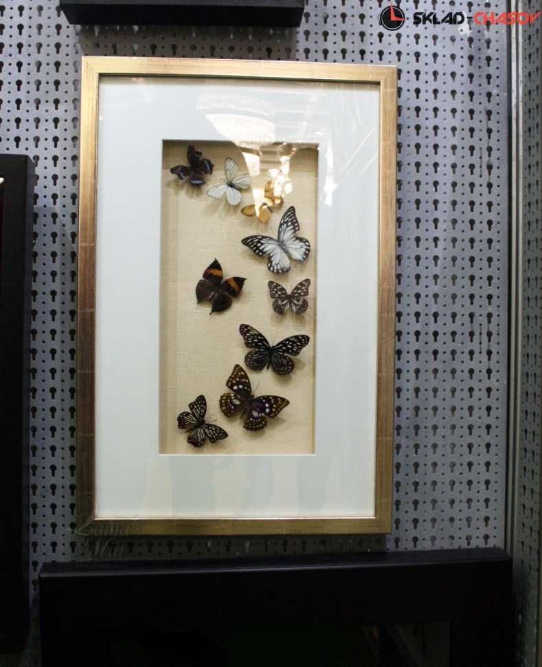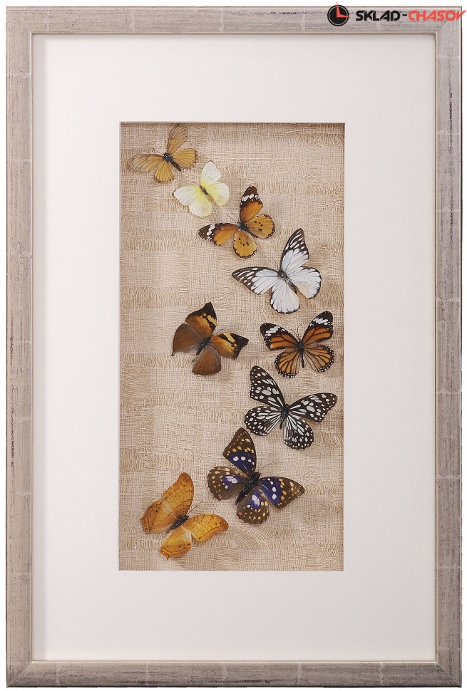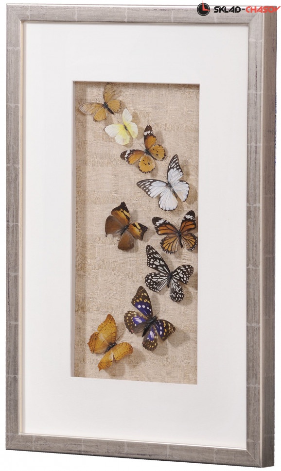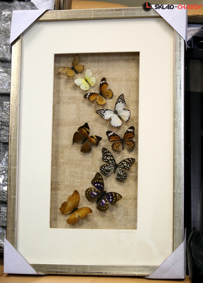 Настенное панно "Бабочки 2" в бежевой деревянной раме под стеклом. Красивое панно с настоящими разноцветными бабочками. Рама светло-бежевая с выраженной древесной текстурой. Подложка из бежевого холста. Размер: 40 х 60 х 3.5 см. Артикул 11843B.