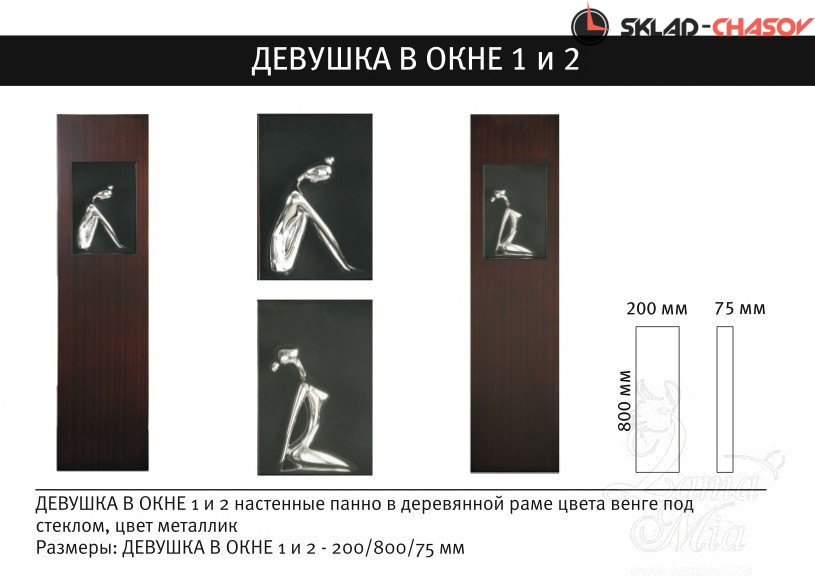 Настенное панно Девушка в окне 2 в деревянной раме цвета венге под стеклом, цвет металлик.