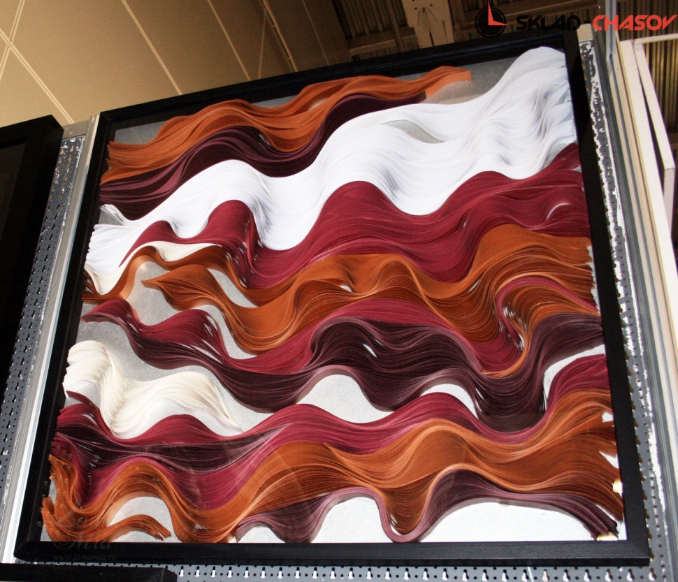 Под стеклом на бежевом фоне из ткани расположены слои цветной бумаги, уложенной волнами.