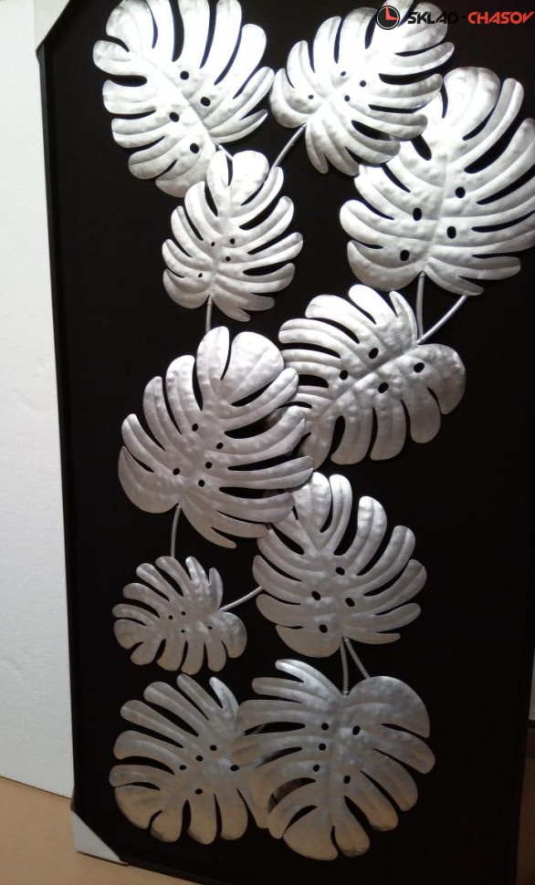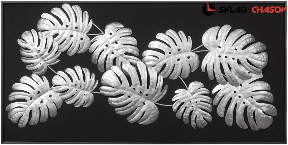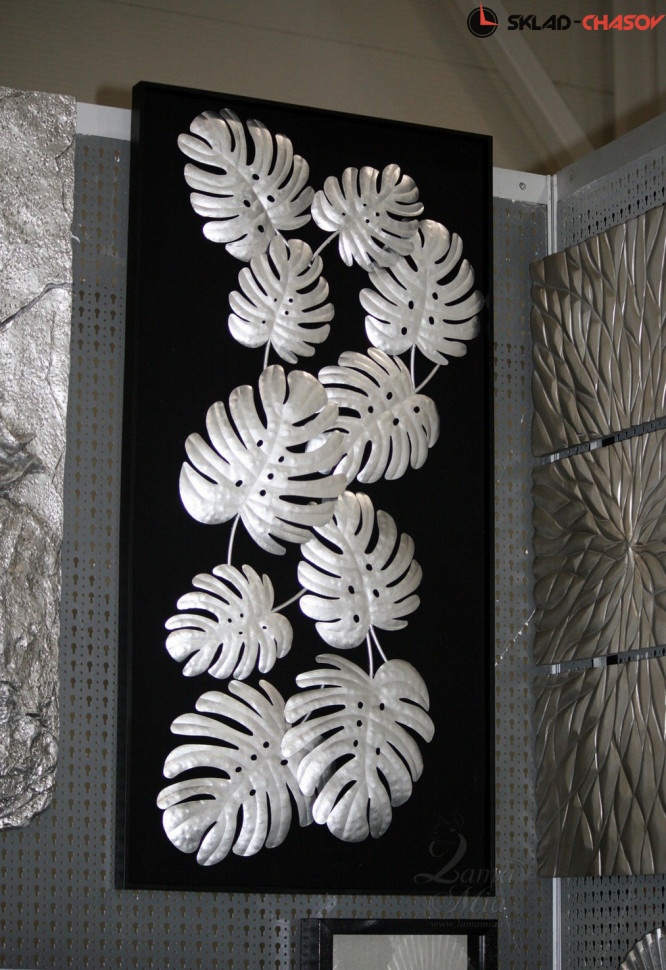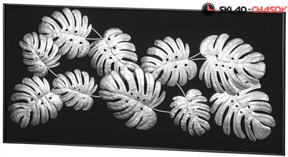Панно декоративное Монстера. Артикул 38398B. Панно "Монстера" - настенное панно из сплава металла покрытого поталью в черной раме из шпонированного МДФ . Цвет панно серебро. Подложка выполнена из фанеры обтянутой холстом черного цвета. Панно можно повесить как вертикально так и горизонтально.