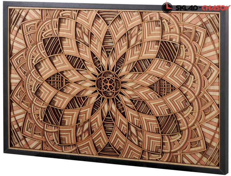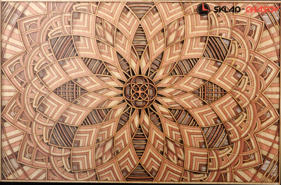 Панно состоит из многослойного орнамента из дерева, тонированного в оттенки коричневого цвета.