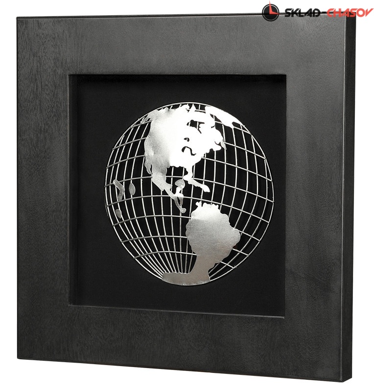 Настенное квадратное панно в строгой чёрной деревянной раме. Под стеклом на чёрном фоне расположена металлическая полусфера глобуса, который повёрнут к зрителю американскими континентами.